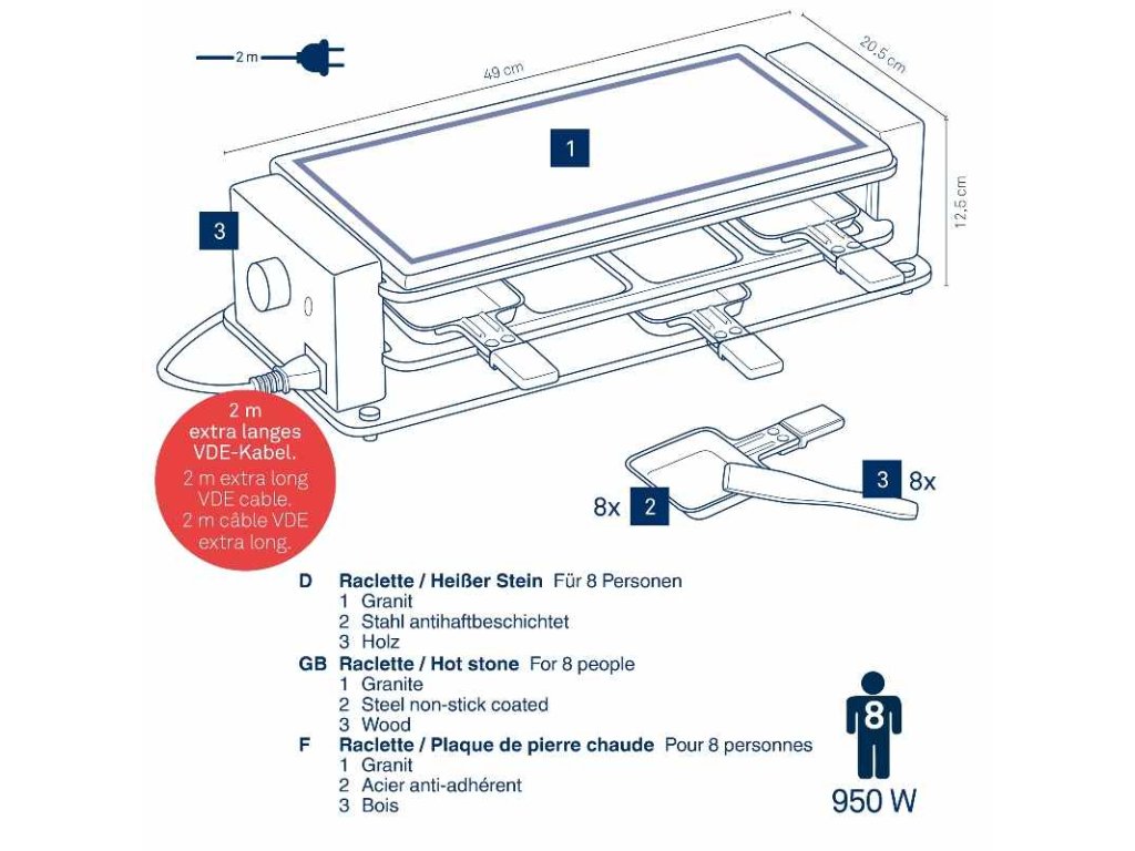 Díky plynule regulovatelnému přívodu tepla s kontrolkou máte teplotu vždy přesně pod kontrolou. Součástí sady jsou praktické pánve na raclette a lopatky.