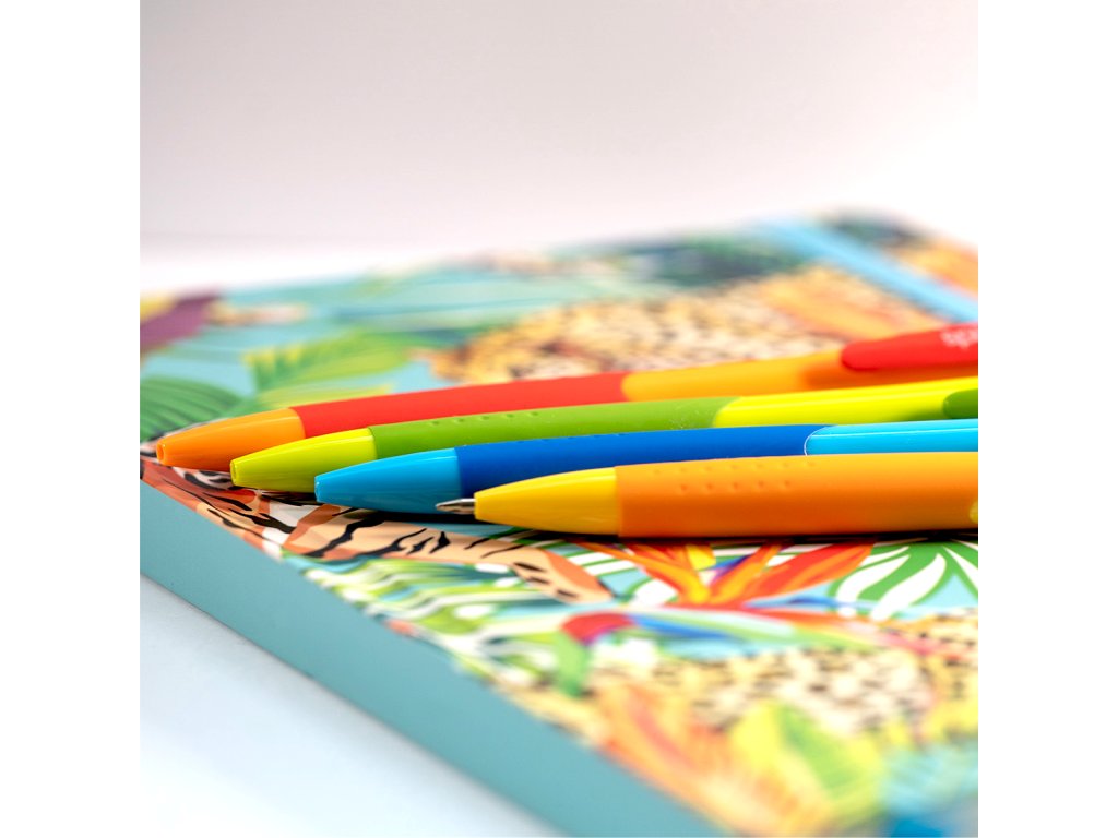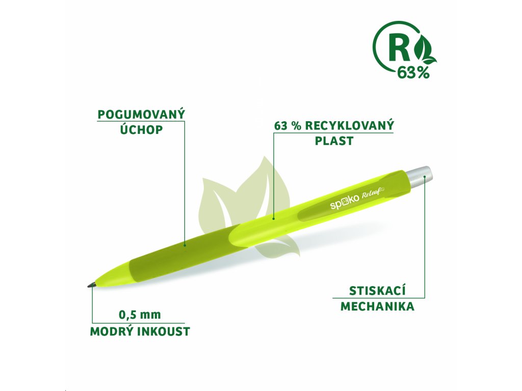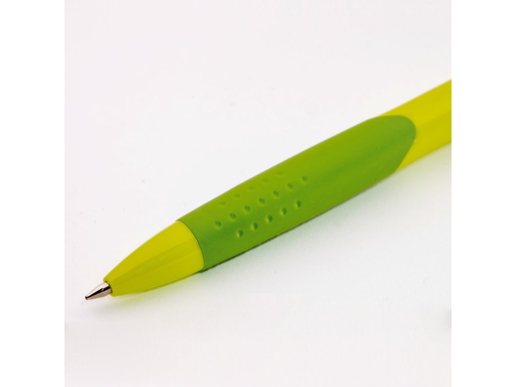 Kuličkové pero se stiskací mechanikou v barevném mixu. Příjemný pogumovaný úchop pro komfortní držení a psaní. Dvoubarevné provedení pera, stiskací mechanika se stříbrnou koncovkou. Tištěné logo na klipu. Vyrobeno ze 63 % recyklovaného plastu.Doplňkové parametry