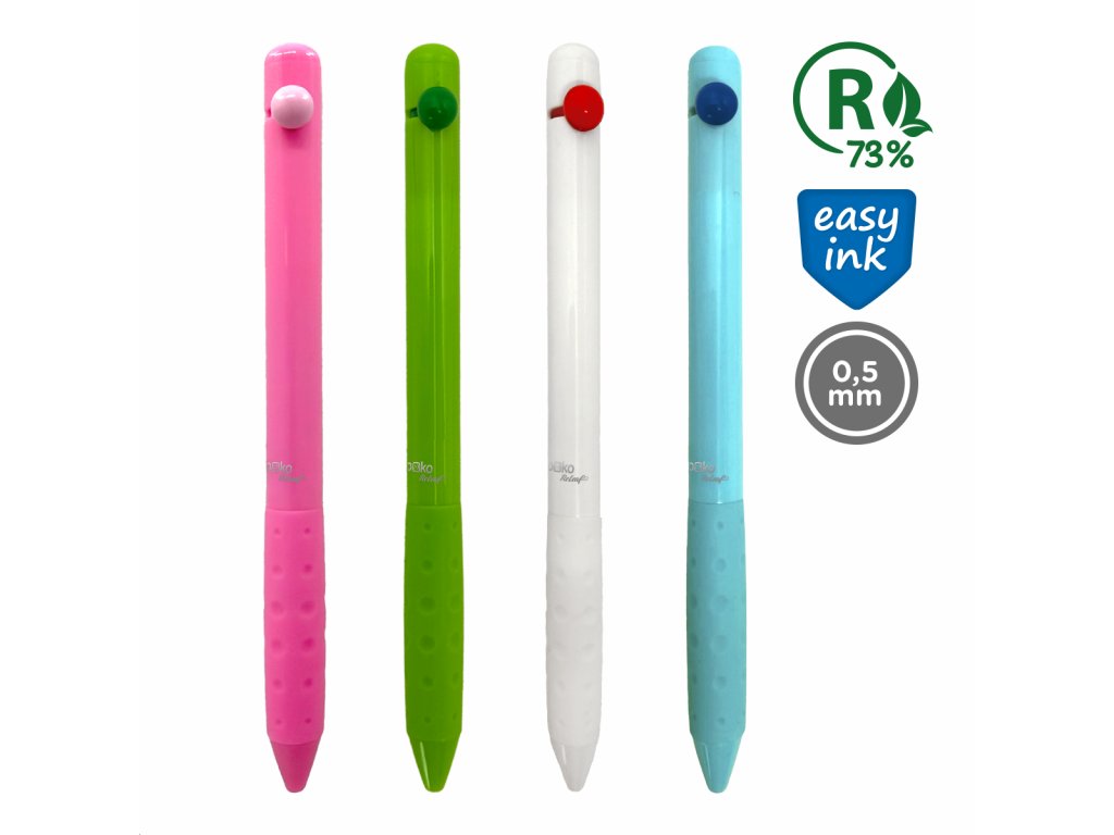 Kuličkové pero, které při práci zabaví všechny neposedné prsty. Lesklé barevné tělo s reliéfní úchopovou zónou zaručí pohodlný úchop. Stiskací mechanika ve formě pohyblivé kuličky pro snadné zapnutí nebo vypnutí, elegantní tištěné logo na těle pera. Jedinečná náplň Easy Ink – inkoust s nízkou viskozitou pro pohodlnější a plynulejší psaní. Vyrobeno ze 73 % recyklovaného plastu.Doplňkové parametry