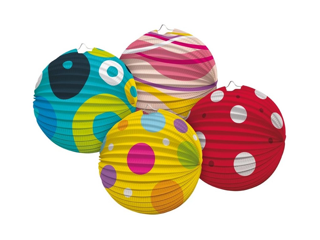 Papírový kulatý lampión barevný. Vhodná dekorace na party, lampiónový průvod, zahradní slavnost, karneval, oslavu narozenin nebo jen tak na zavěšení do dětského pokojíčku. Vyberte si svůj lampion a udělejte z běžného večera kouzelný. Lampión je z nehořlavého papíru a má držák na svíčku nebo žárovku. Lampión je bez hůlky a světýlka. Lampión má poutko na zavěšení. Materiál: papír, kov Průměr lampiónu: 25 cm Motivy: puntíky, kruhy, čáryDoplňkové parametry