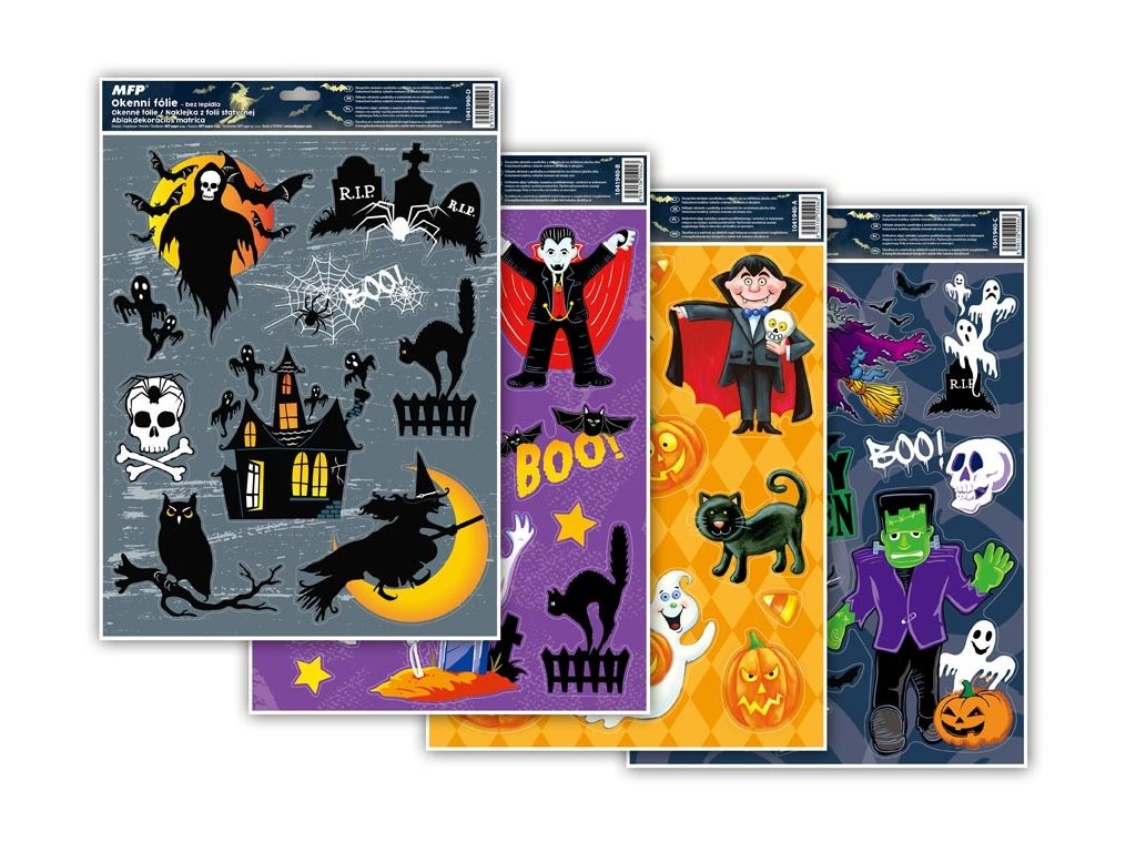 Okenní fólie glitrové - Halloween - Vyzdobte si okno těmito krásnými samolepkami na okno. Vytvoří Vám tu pravou halloweenskou atmosféru. NÁVOD: Sloupněte z podložky obrázek a umístěte na čisté, případně navlhčené sklo stranou, která byla na podložce. Obrázek elektrostaticky přilne. Folie se snadno sloupne a dá se přemístit. Rozměr: 420mm x 300mm x 1mm (Š x V x H)Doplňkové parametry