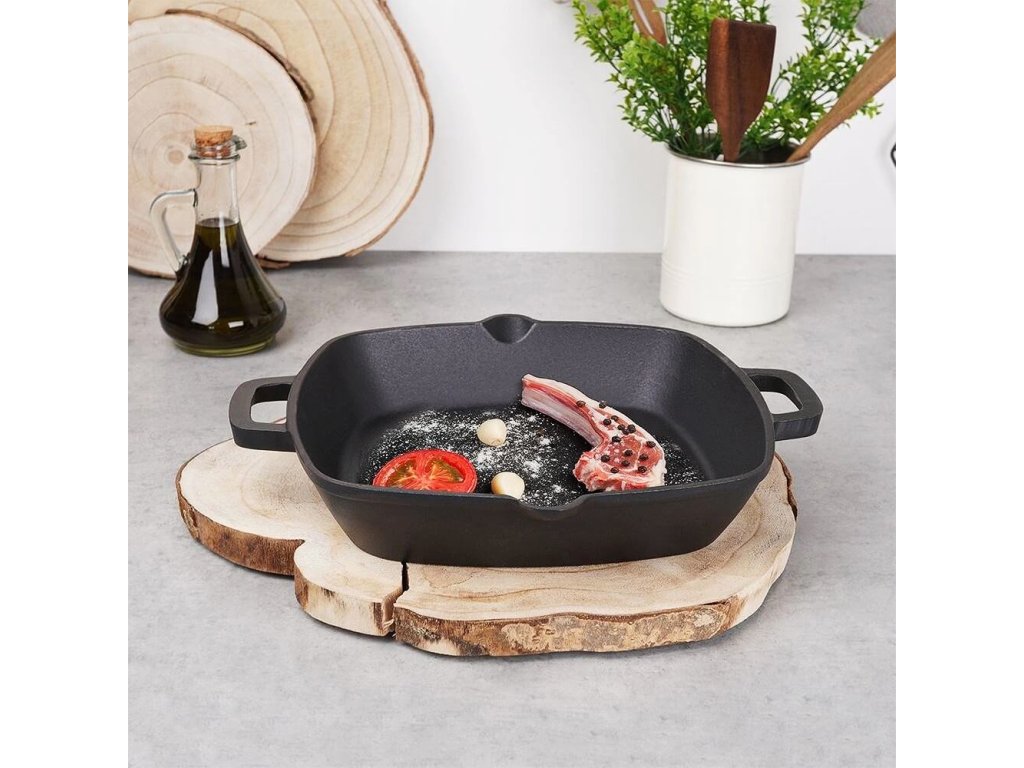Masivní litinový pekáč s rozměry 25 x 25 cm pro intenzivní i pozvolné opékání masa, zeleniny a dalších oblíbených pokrmů na všech typech sporáků, v troubě i na grilu nebo na ohni.Trend návratu k původním, léty vyzkoušeným materiálům, se projevuje i v oblasti gastronomie a domácího vaření. S tím přichází i obliba litinového nádobí. Pekáč z litiny Vám pomůže při přípravě chutných pokrmů z masa, zeleniny i brambor. Po postupném zahřátí snese i vysoké teploty, maso se i na menším množství tuku rychle zatáhne a šťáva tak zůstane pěkně uvnitř. Má dvě výlevky, takže výpek, redukovanou šťávu i omáčku lze snadno slít.