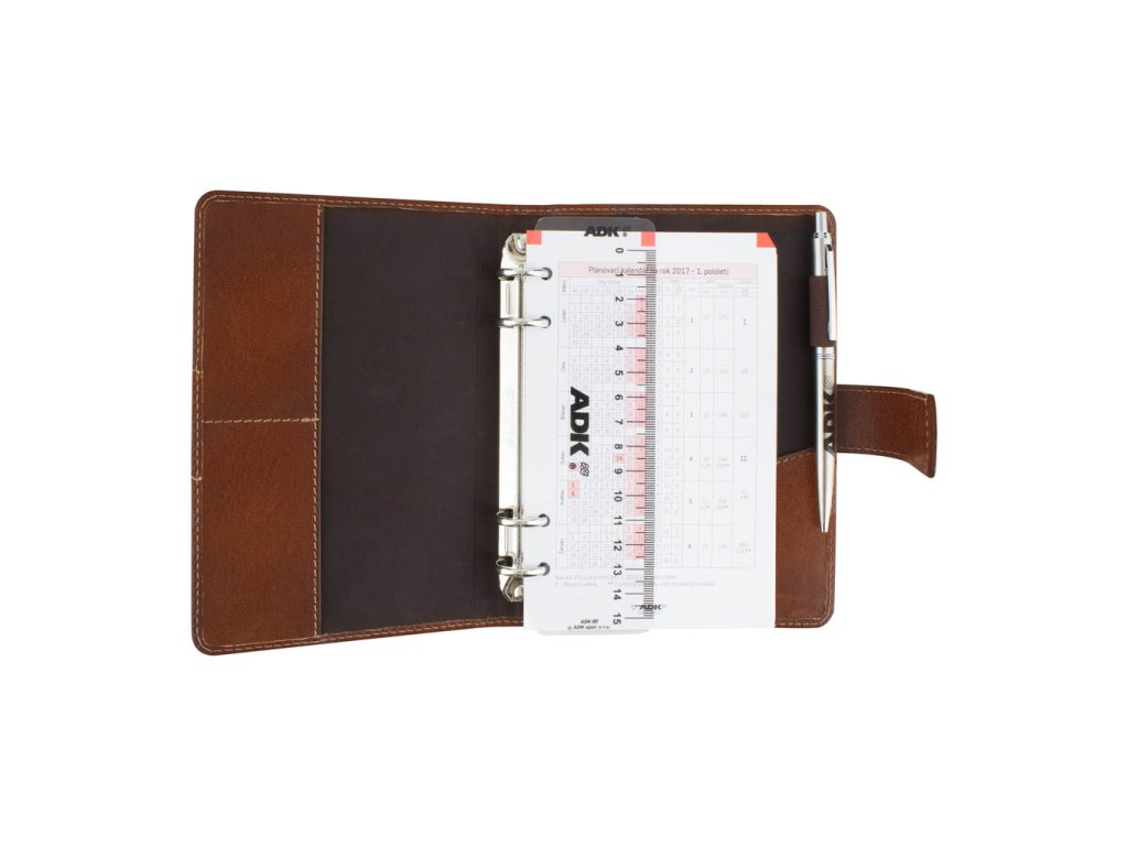 minimalistický týdenní kožený kroužkový diář ADK Pelle6 formátu A6 s kontrastním prošitím, desky jsou šité ručně v České republice z luxusní italské ručně tampónované hověziny zpracované přírodním způsobem, pohodlné a rychlé zavírání díky magnetické zápince, jednoduché praktické vnitřní uspořádání, tenčí slim provedení, diář je dodáván včetně týdenního plánování, poznámkových listů, kuličkové tužky ADK a pravítka, rozměry: 30 x 125 x 180 mmDoplňkové parametry