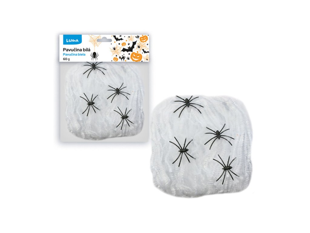 dekorační bílá pavučina, 4 pavouci součástí balení, hmotnost: 60g