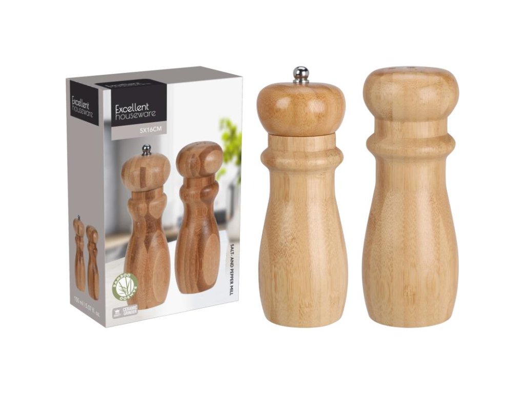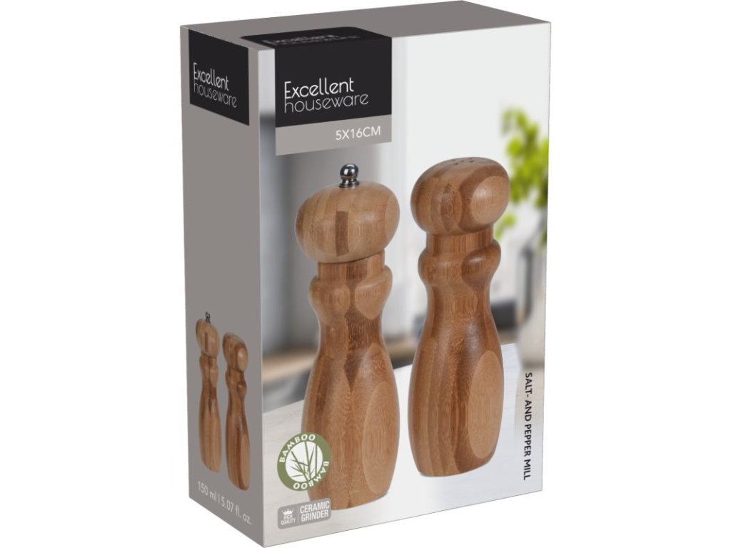 Stylová sada dvou mlýnků vyrobených z kvalitního bambusu (Edulis), která kombinuje přírodní vzhled s praktičností. Mlýnek na pepř je vybaven odolným keramickým mechanismem pro rovnoměrné mletí, zatímco mlýnek na sůl má PP zátku, která chrání obsah před vlhkostí. Díky objemu 150 ml jsou ideální pro každodenní použití a zároveň působí elegantně při servírování na stole.
