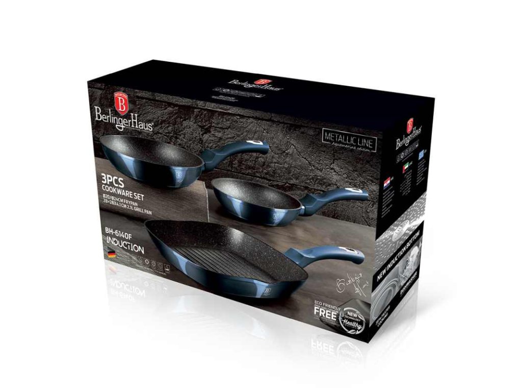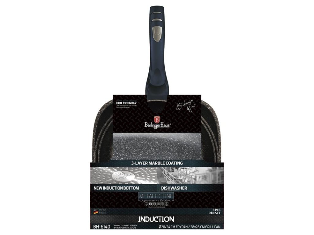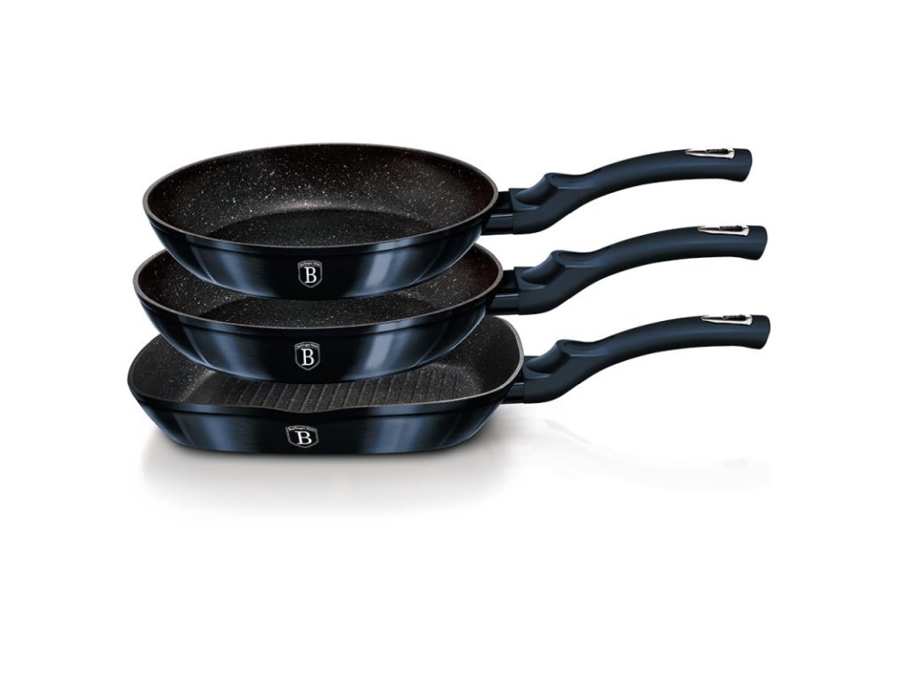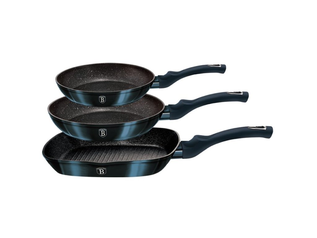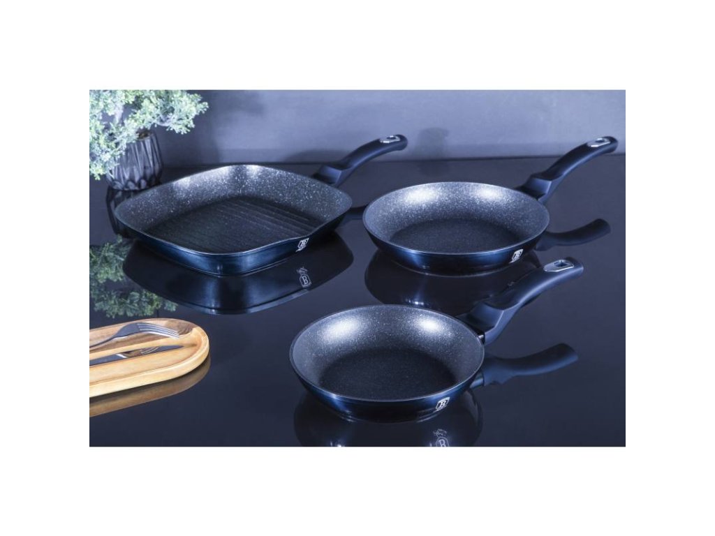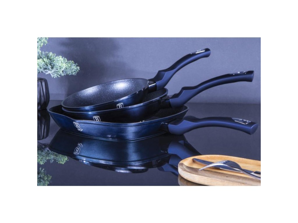 - Třídílná sada pánví z kolekce Aquamarine Metallic Line zaujme nejen nepřehlédnutelným moderním designem v temně modré barvě, ale především svými jedinečnými vlastnostmi- doménou této sady je 3vrstvý nepřilnavý povrch s mramorovým designem charakteristický svou dokonalou nepřilnavostí, žádné potraviny se nepřipalují a díky tomu se kastroly i pánve velice snadno čistí