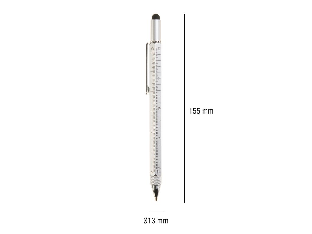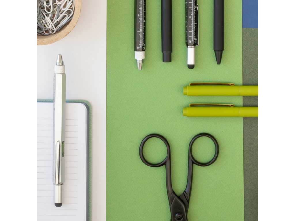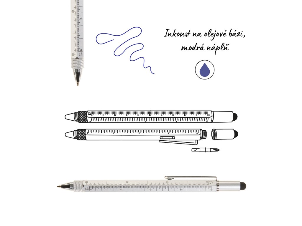 | 5 v 1: | kuličkové pero, pravítko v centimetrech i palcích, vodováha, plochý a křížový šroubovák, dotykový stylus pro tablety a smartphony |