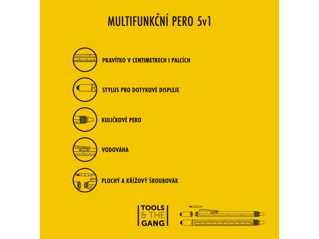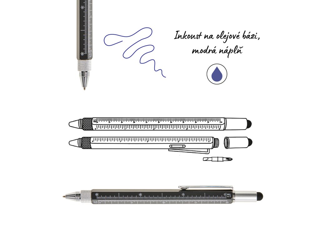 | 5 v 1: | kuličkové pero, pravítko v centimetrech i palcích, vodováha, plochý a křížový šroubovák, dotykový stylus pro tablety a smartphony |