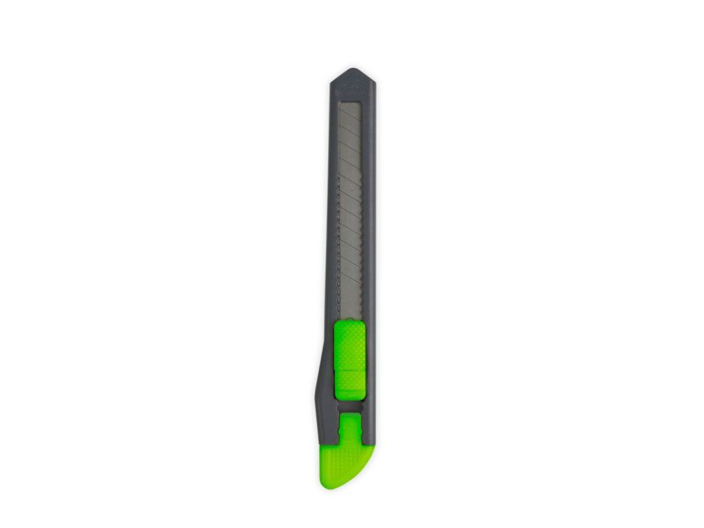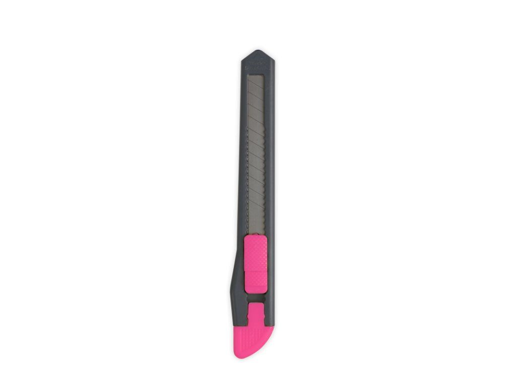 plastový lehký zatahovatelný nůž s čepelí pro kancelář a hobby, k dispozici v 4 neonových barvách (růžová, modrá, zelená, žlutá), bezpečnostní zámek nože, lze použít na papír, karton, polystyren, pásky, kůži), se sundavacím klipem s drážkou na bezpečné zalomení čepeleDoplňkové parametry