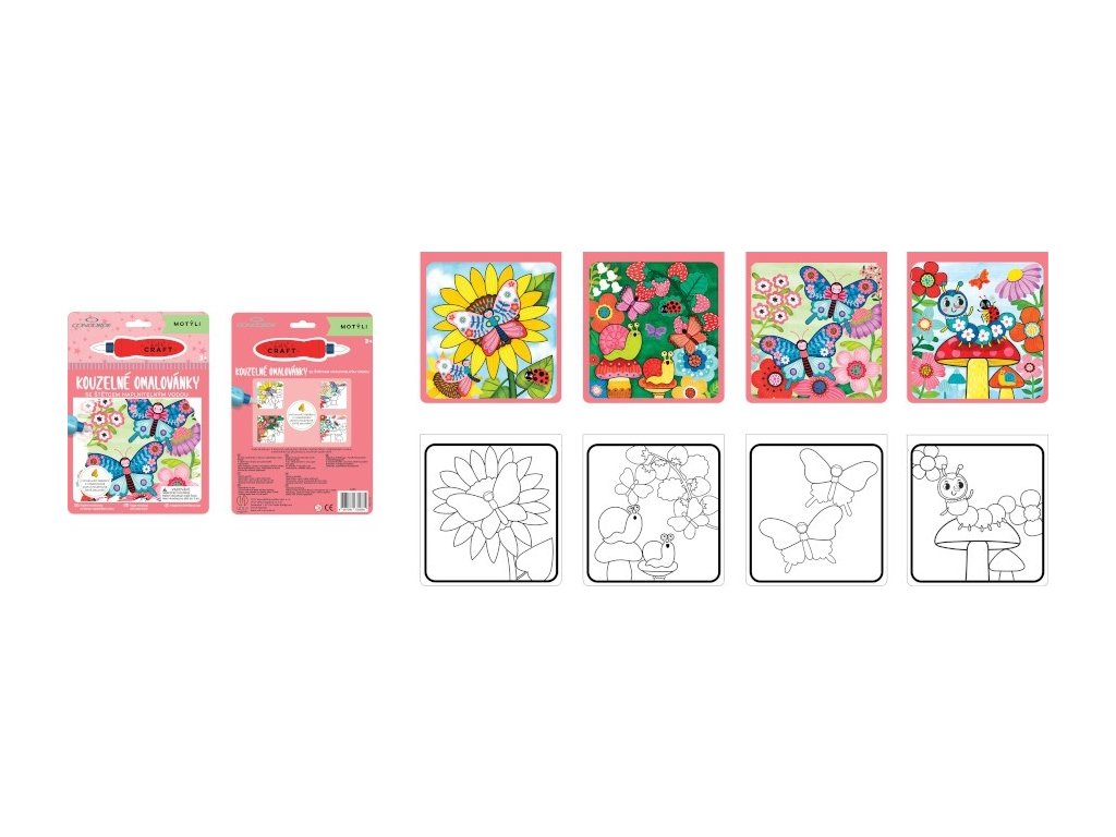 kouzelné omalovánky disponují čtyřmi obrázky, štětec se naplní vodou a po rozetření vody na bílou plochu obrázky získají barvu, po vybarvení se omalovánky nechají uschnout a po úplném uschnutí jsou znovu použitelné, balení obsahuje: 4 znovupoužitelné obrázkové plochy z tvrdého kartonu a speciální vodou plnitelný štětecDoplňkové parametry