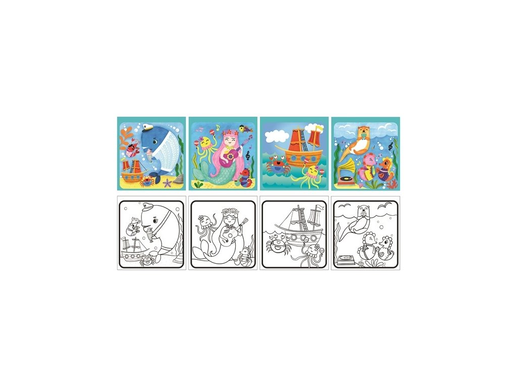 kouzelné omalovánky disponují čtyřmi obrázky, štětec se naplní vodou a po rozetření vody na bílou plochu obrázky získají barvu, po vybarvení se omalovánky nechají uschnout a po úplném uschnutí jsou znovu použitelné, balení obsahuje: 4 znovupoužitelné obrázkové plochy z tvrdého kartonu a speciální vodou plnitelný štětecDoplňkové parametry