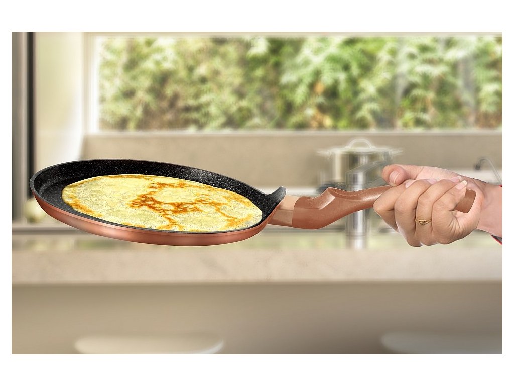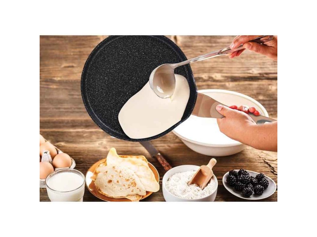 Velkou výhodou palačinkových pánví je, že díky jejich plochému povrchu snadno připravíte tenké, jemné a lahodné palačinky a další podobné pokrmy. Kvalitní povrch pánví zajistí, že se vám nebudou palačinky ani omelety připalovat nebo trhat. Doporučujeme při přípravě těsta dodržet správný poměr tekutiny a mouky, aby byla zajištěna správná konzistence těsta. Pánev je snadno omyvatelná a dobře se s ní manipuluje.