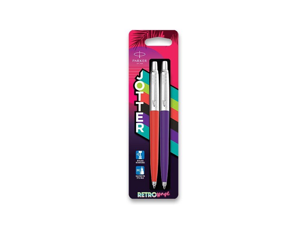 PROČ SI ZVOLIT PRÁVĚ PARKER JOTTER ORIGINALS?, 1. Designová ikona z 80. let v moderním provedení, Parker Jotter Originals v sobě snoubí to nejlepší z kultovního designu 80. let a moderních technologií. Retro vzhled v živých barvách červené a fialové dodá vašemu psaní šmrnc a, osobitost. Zároveň však pero disponuje nejnovějšími technologiemi pro pohodlné a plynulé psaní., 2. Prémiové materiály pro dlouhou životnost, Tělo pera je vyrobeno z odolného tvrzeného plastu, který je zárukou dlouhé životnosti. Doplňky z kvalitní nerezové oceli dodávají peru na eleganci a zároveň zvyšují jeho odolnost., 3. Pohodlné psaní, Pero skvěle padne do ruky. Psaní je tak pohodlné i při dlouhých písemných úkolech. Stiskací mechanismus zajišťuje rychlé a snadné ovládání jednou rukou. Šíře stopy M je ideální, pro většinu písemných potřeb. Vhodné i pro leváky., 4. Spolehlivost prověřená generacemi, Parker Jotter je jedním z nejprodávanějších per na světě, a to již od roku 1954. Svou popularitu si získal díky spolehlivosti, se kterou píše v každé situaci. Ať už potřebujete rychle, zapsat poznámky na schůzce, podepsat důležité dokumenty nebo napsat dlouhý dopis, na pero Parker Jotter se můžete vždy spolehnout., 5. Perfektní dárek pro každou příležitost, Sada dvou per Parker Jotter Originals je ideálním dárkem pro vaše blízké. Darujte psací potřebu, která zaujme svým designem a potěší svou kvalitou., Často kladené otázky:, Q: Jak dlouho vydrží náplň v peru?, A: Výdrž náplně závisí na technice a frekvenci používání, ale jedna náplň vystačí na stopu dlouhou 3 500 m., Q: Lze dokoupit náhradní náplně?, A: Ano, pero používá standardní náplně Parker, které jsou snadno k dostání.Doplňkové parametry