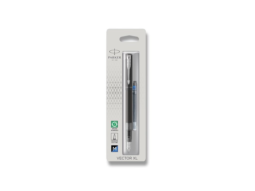* přizpůsobeno výhradně k používání inkoustových bombiček QUINK nebo konvertoru (není součástí balení), Dodáváno na blistru., Kolekce Vector XL se pyšní rysy typickými pro modelovou řadu Vector, pouze v provedení XL. Díky prověřenému mistrovství značky Parker je Vector psacím nástrojem, kterému lze beze zbytku, důvěřovat.