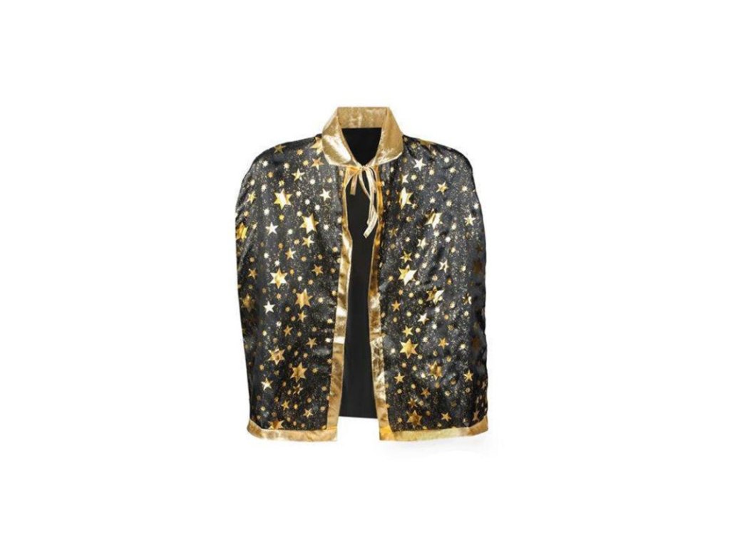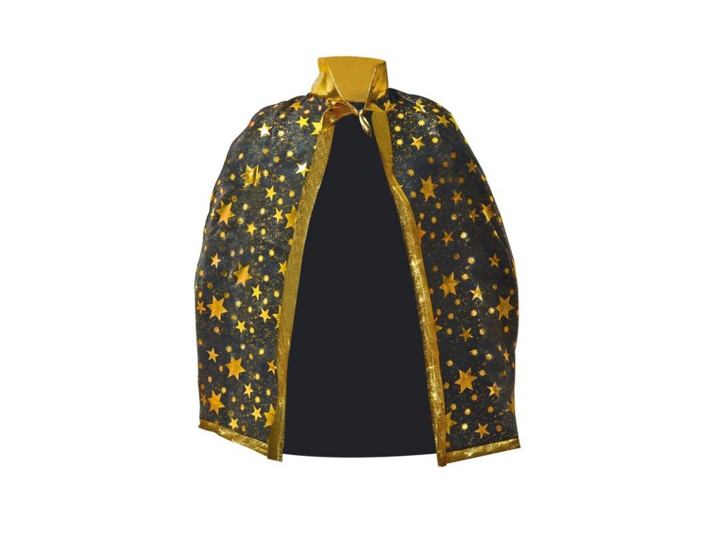 Čarodějnický plášť se zlatými hvězdami, vhodný ke kostýmu černokněžníka nebo kouzelníka, černozlatá kombinace pro výrazný efekt, lehká látka se zavazováním na šňůrky, délka 60 cm, celkový rozměr 60 × 75 cm.Doplňkové parametry
