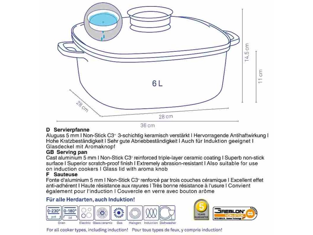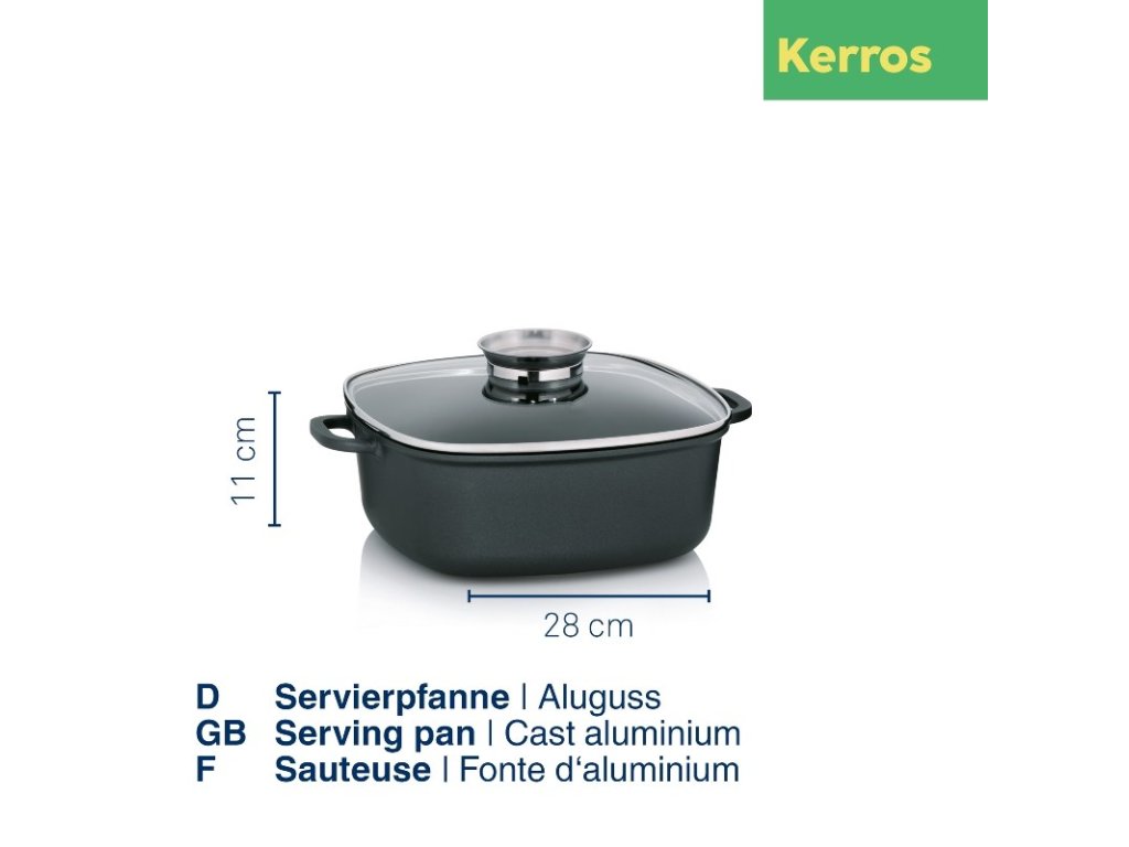 Kerros série je vyrobena ze silného litého hliníku s tloušťkou stěny 5 mm. Zvláštní znak kvality: 6 hvězdičkový nepřilnavý povrch GREBLON-C3+. 3-vrstvá, keramikou plněná teflonová vrstva se vyznačuje vynikající anti-adhezním efektem, vysokou odolností proti poškrábání a velmi dobrou odolností proti oděru.