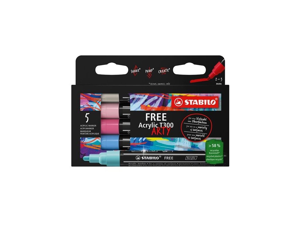 S řadou STABILO FREE Acrylic Marker můžete téměř neomezeně navrhovat a individualizovatVhodný na různé povrchy - papír, karton, plátno, keramiku, kámen nebo umělou kůži Neprůhledná a světlostálá pigmentová akrylová barvaKaždý může nechat volný průběh své kreativitě při psaní, malování, značkování, šrafování a konturováníAkrylový popisovač s pigmentovaným inkoustem na vodní báziSnadná aktivace dobu 30 sekund a následné pumpováníPo zaschnutí hedvábně matný a přetíratelnýVyrobený z 50% recyklovaného plastuOdolný vůči povětrnostním vlivůmLze míchat a mísit s vodou Horizontální skladování pro dlouhou životnostObsah sady: 5x T300 s kulatým hrotem - sada 5 barevDoplňkové parametry
