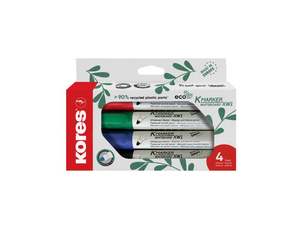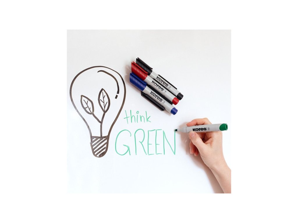 popisovač na bílé tabule a flipcharty vysoké kvality, unikátní design, rychle zasychá, bez zápachu, plastové části jsou vyrobeny z 90% z recyklovaných materiálů, baleno v papírové krabičce, bez použití plastu, vydrží bez víčka až několik dní, může být použit na sklo a jiné neporézní povrchy, snadno smazatelné z bílých tabulí, nezanechává šmouhy, živé a neprůsvitné barvy na všech typech bílých tabulí, netoxický – neobsahuje xylen, toluen a benzen, 4 barvy - černá, modrá, zelená a červená, kulatý hrot – 3 mm, vyrobeno v ČRDoplňkové parametry