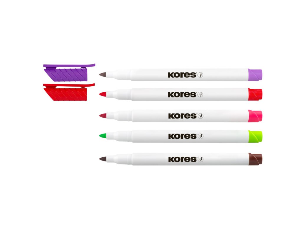 vysoce kvalitní tenké popisovače na bílé tabule nebo dětské tabulky s jemným hrotem, rychle zasychají, netoxické, bez xylenu, toluenu a benzenu, může být použit na sklo a jiné neporézní povrchy, snadno smazatelné z bílých tabulí i za sucha bez zanechání stop, živé a neprůsvitné barvy na všech typech bílých tabulí, hladký a moderní design s Kores víčkemDoplňkové parametry