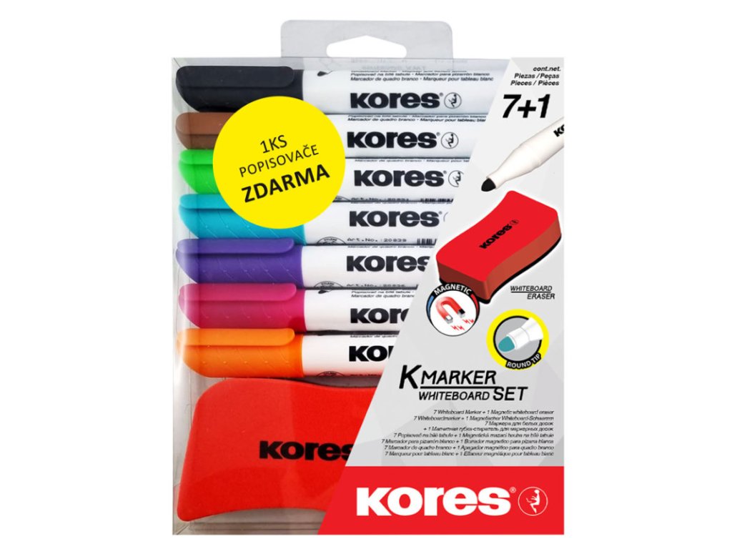 sada obsahuje: 7ks popisovačů na bílé tabule s kulatým hrotem + mazací magnetickou houbičku, popisovač na bílé tabule a flipcharty vysoké kvality, rychle zasychá, vydrží bez víčka až několik dní, může být použit na sklo a jiné neporézní povrchy, snadno smazatelné z bílých tabulí, nezanechává šmouhy, živé a neprůsvitné barvy na všech typech bílých tabulí, 7 barev - černá, růžová, tyrkysová, oranžová, hnědá, fialová, světle zelená, kulatý hrot – 3 mm, magnetická stírací houbička na bílé tabule - ergonomický tvar pro komfortní používání, rozměr: 110 x 55 x 20 mm, vyrobeno v ČRDoplňkové parametry