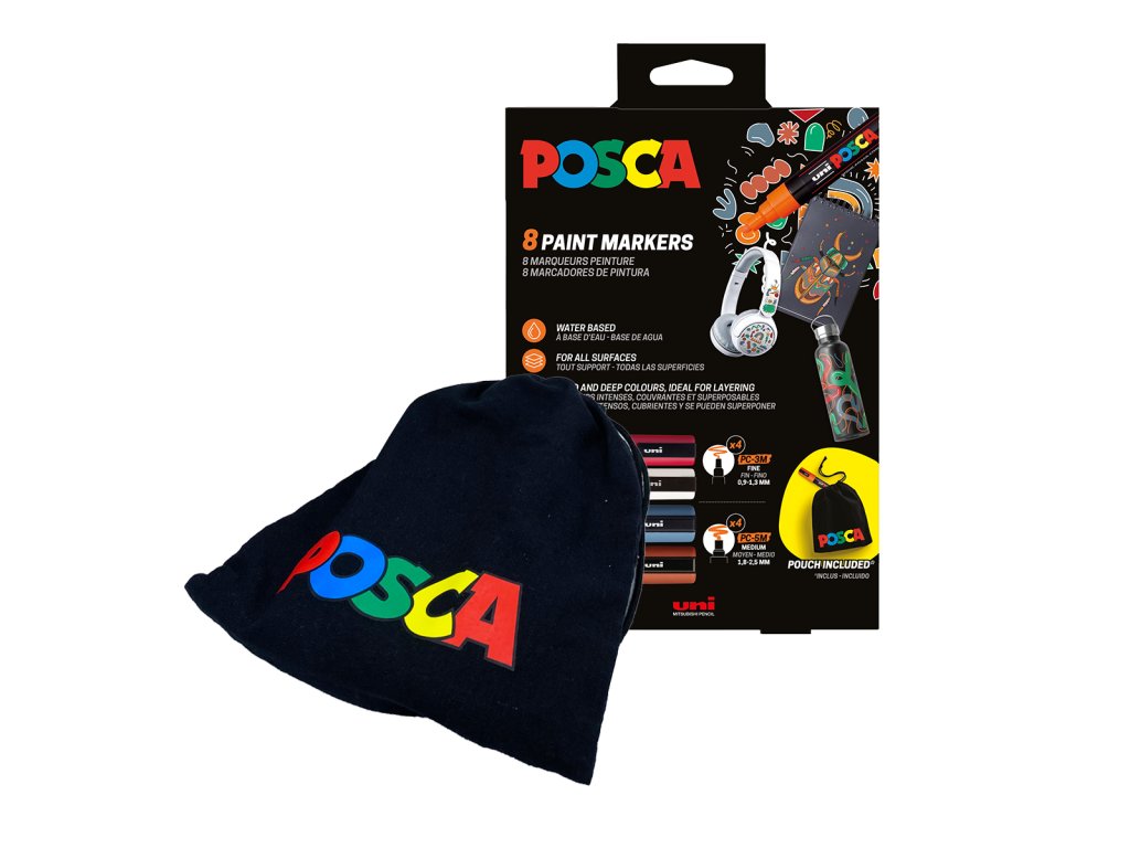 Kombinovaná sada popisovačů velikostí PC-3M a PC-5M v mixu barev. Sada je doplněna o zbrusu nový odstín kaštanové. Součástí balení je stahovací bavlněný pytlík POSCA pro rychlé uschování popisovačů.Doplňkové parametry