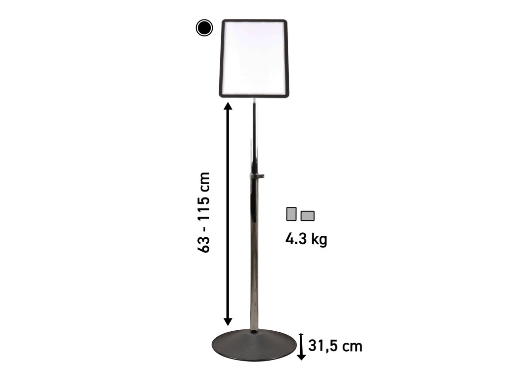 Podlahový stojan s otočným systémem a magnetickou fixací rámečku. Široké otevření rámečku ze tří stran pro snadné vkládání dokumentu. Variabilní úhel čtení, vertikální nebo horizontální zobrazení. Stabilní bezpečná základna, teleskopická tyč pro přizpůsobení výšky stojanu. Ideální nástroj LEAN pro zvýšení efektivity, zlepšení kontroly kvality a usnadnění řízení zásob.Doplňkové parametry