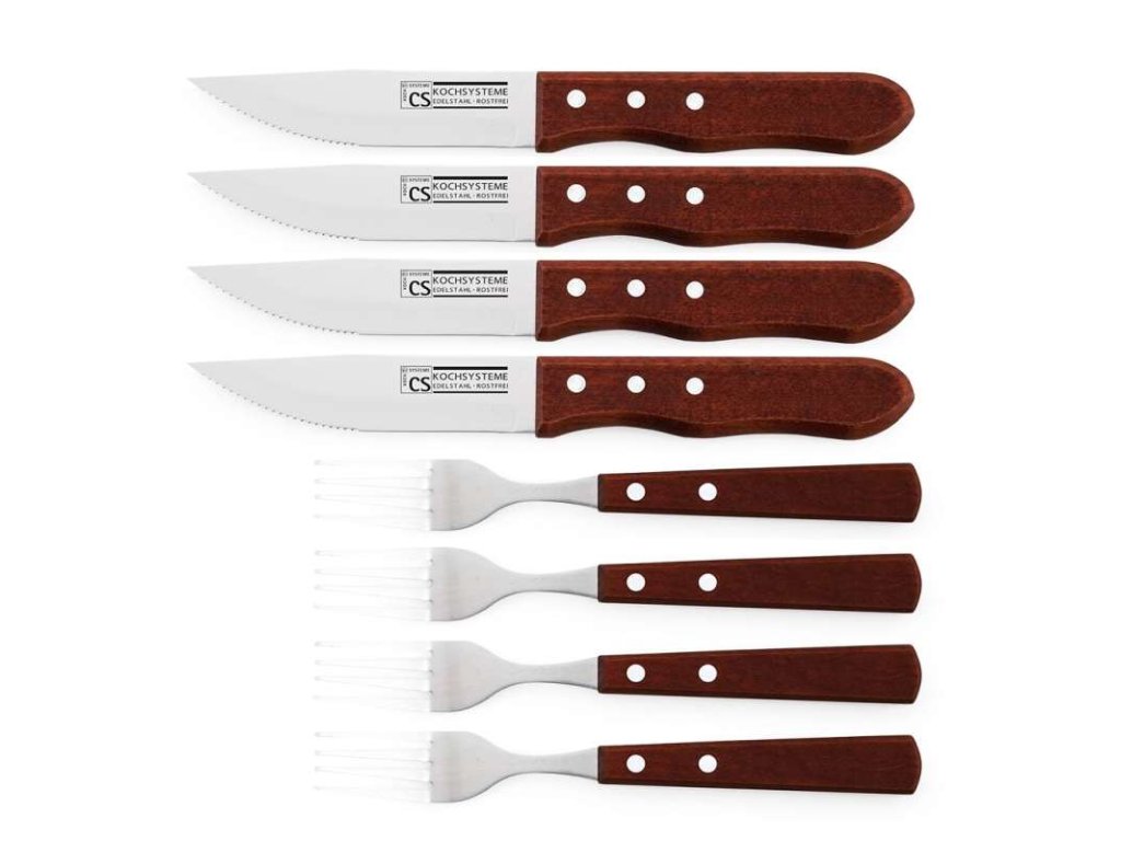 - materiál: nerezová ocel / dřevo- JUMBO provedení, rozšířená čepel oproti klasickým nožům, ideální na steaky- díky ostré špičce a zoubkovanému ostří si poradí i s většími a tužšími kusy masa- ergonomická dřevěná nýtovaná rukojeť- pro dlouhou životnost ostří a dřeva se doporučuje pouze ruční mytí- celková délka nože: 25 cm- délka čepele: 12 cm- šířka čepele: 2.5 cm- celková délka vidličky: 23 cm- sada 8 ks obsahuje:- 4x JUMBO steakový nůž- 4x steaková vidlička- značka: CS SolingenDoplňkové parametry