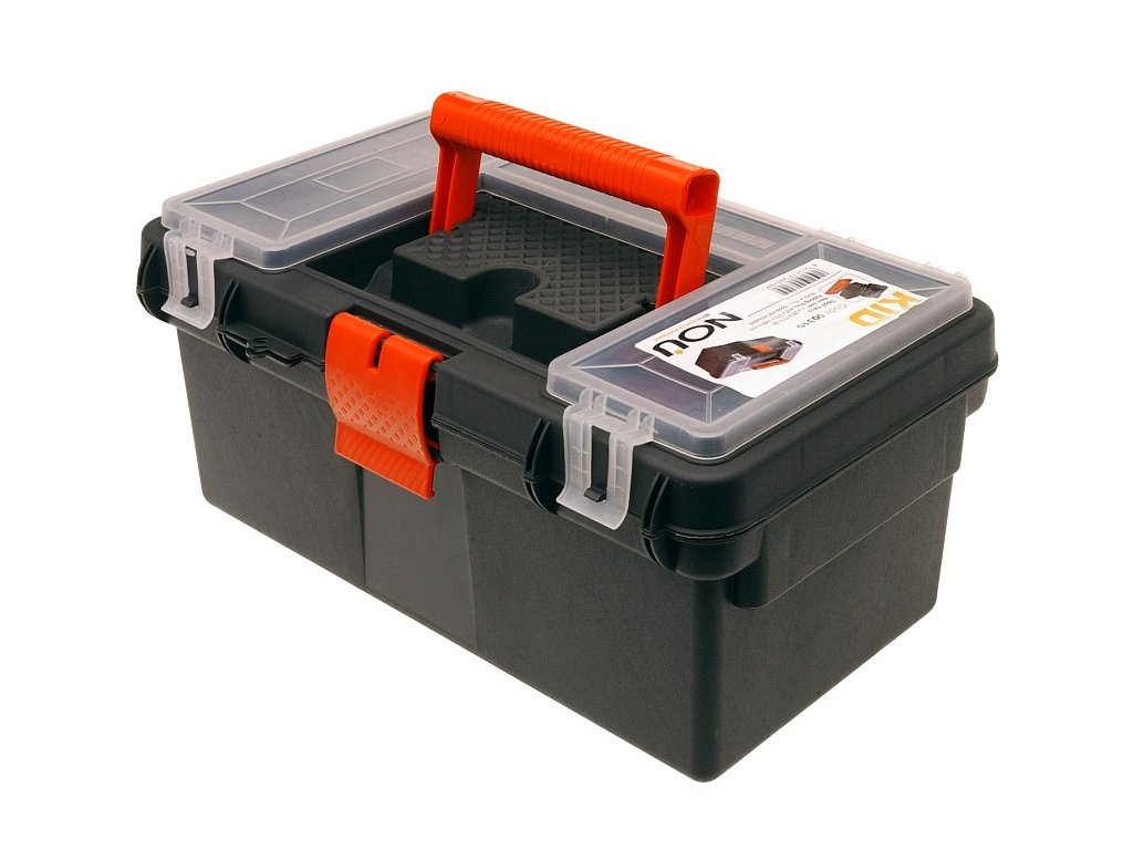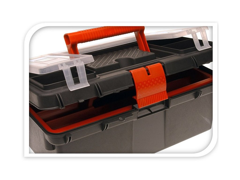 - prostorný přenosný kufr na nářadí z odolného plastu- materiál: tvrzený plast- menší vyjímatelná přihrádka s rukojetí plus velký úložný prostor v kufru- organizér na drobnosti v horním víku - horní rukojeť je sklopná, což se hodí při případném skladování nebo převážení boxu- zavírání na pevný klips- rozměry: 36 x 21 x 16,5 cmDoplňkové parametry