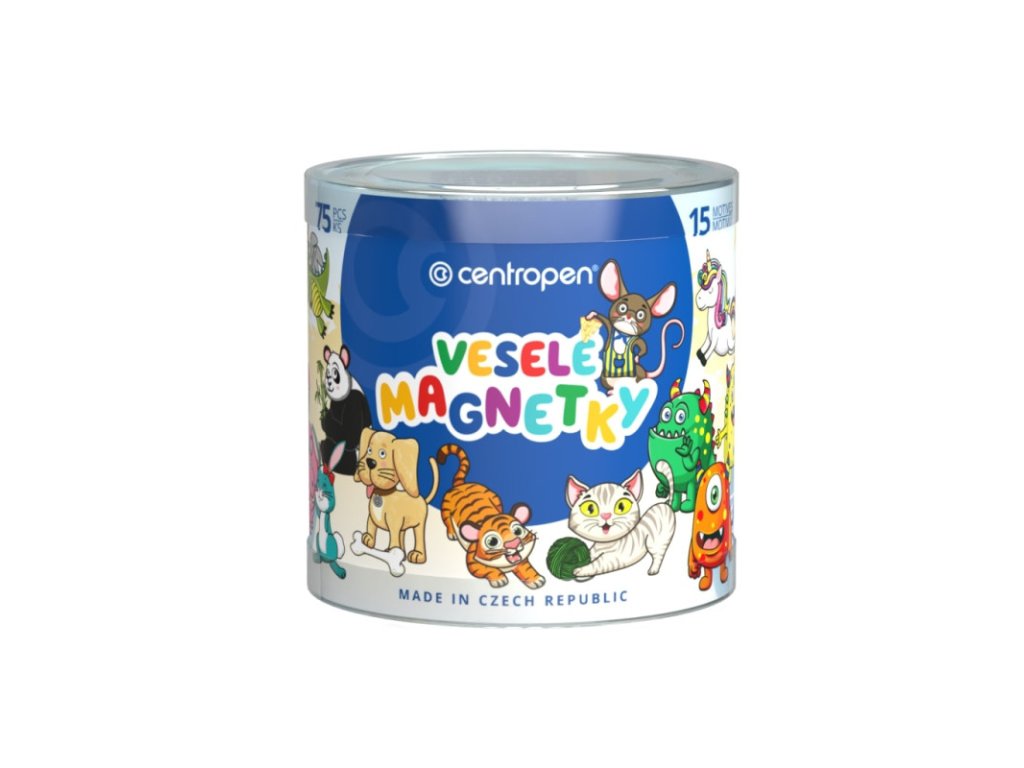 Praktická sada barevných veselých magnetů v plastové dóze. Balení obsahuje 75 kusů magnetů v různých barvách, vhodných pro uchycení dokumentů, poznámek či vzkazů na magnetické tabule, lednice a další kovové povrchy.Doplňkové parametry