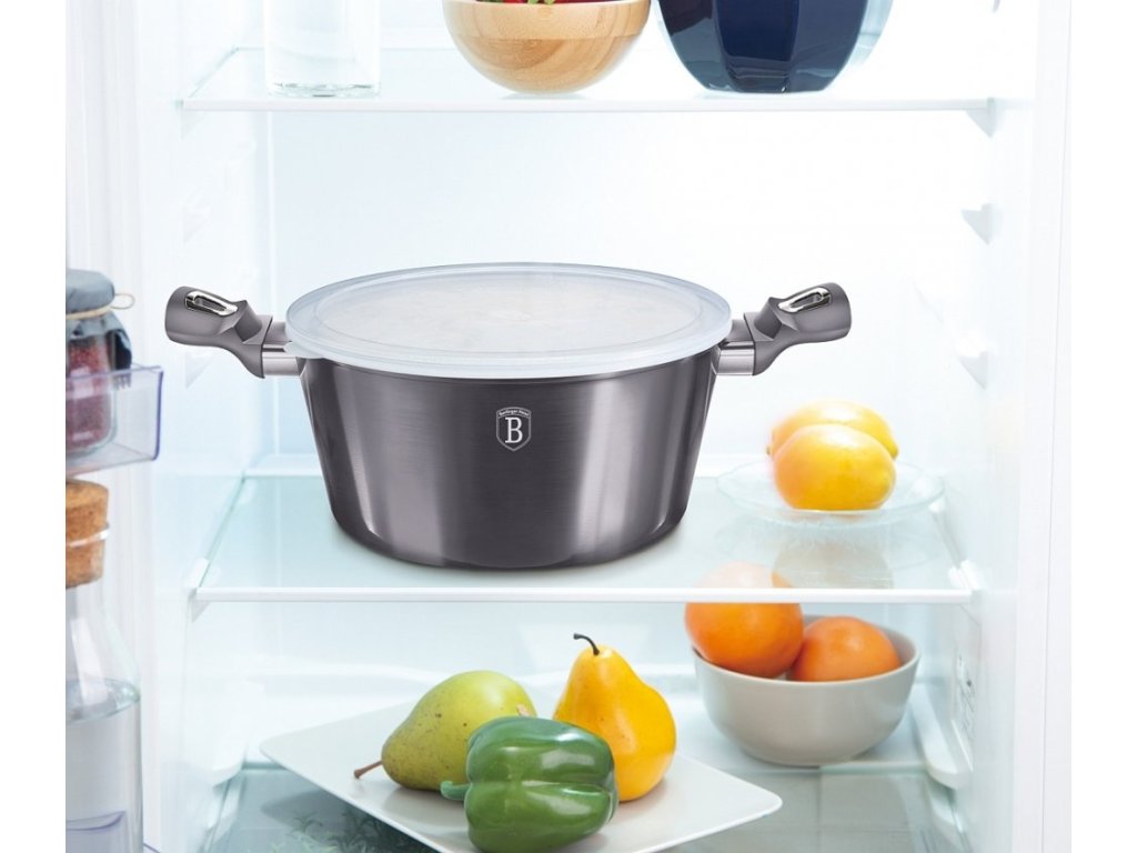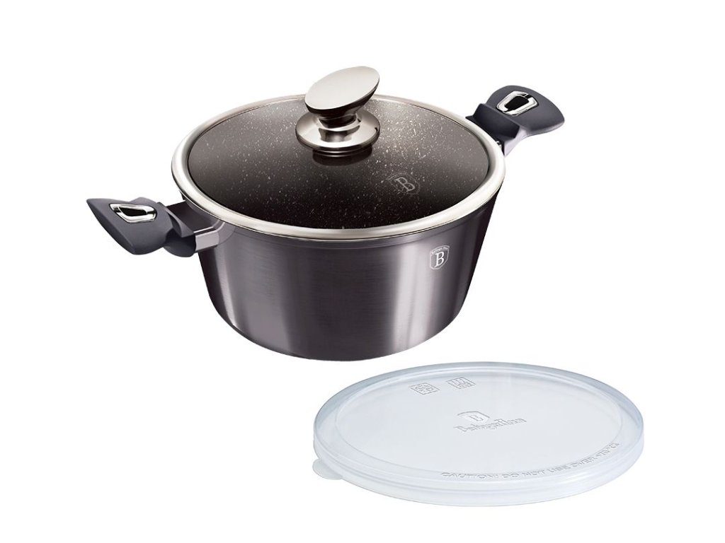 Středně velký kastrol s mramorovým povrchem a poklicí v atraktivním designu. Součástí kastrolu je také přesně padnoucí plastové víko, které vám usnadní skladování uvařeného jídla třeba přímo v lednici.- 3vrstvý povrch s mramorovým designem charakteristický svou dokonalou nepřilnavostí, připravované potraviny se nepřipalují a díky tomu se nádobí velmi jednoduše čistí