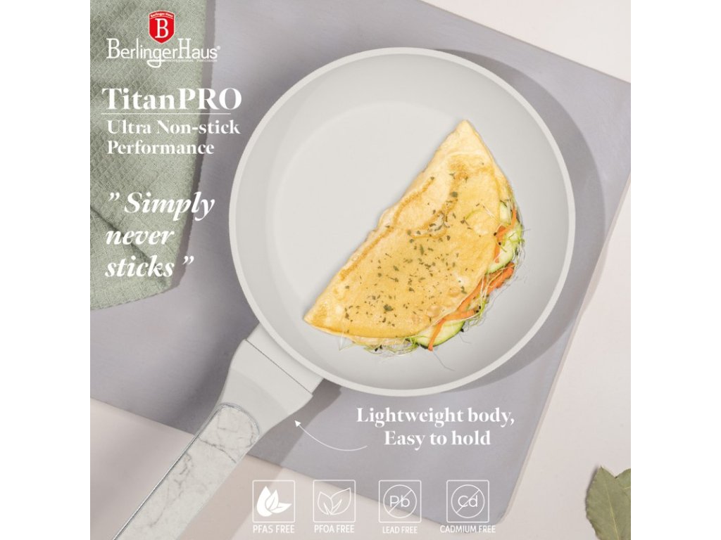 Třívrstvý titanový povrch je navržen tak, aby vydržel každodenní výzvy. Nelepí, nepřipaluje, snadno se čistí a přitom neobsahuje škodliviny – pro zdravější a pohodlnější vaření.