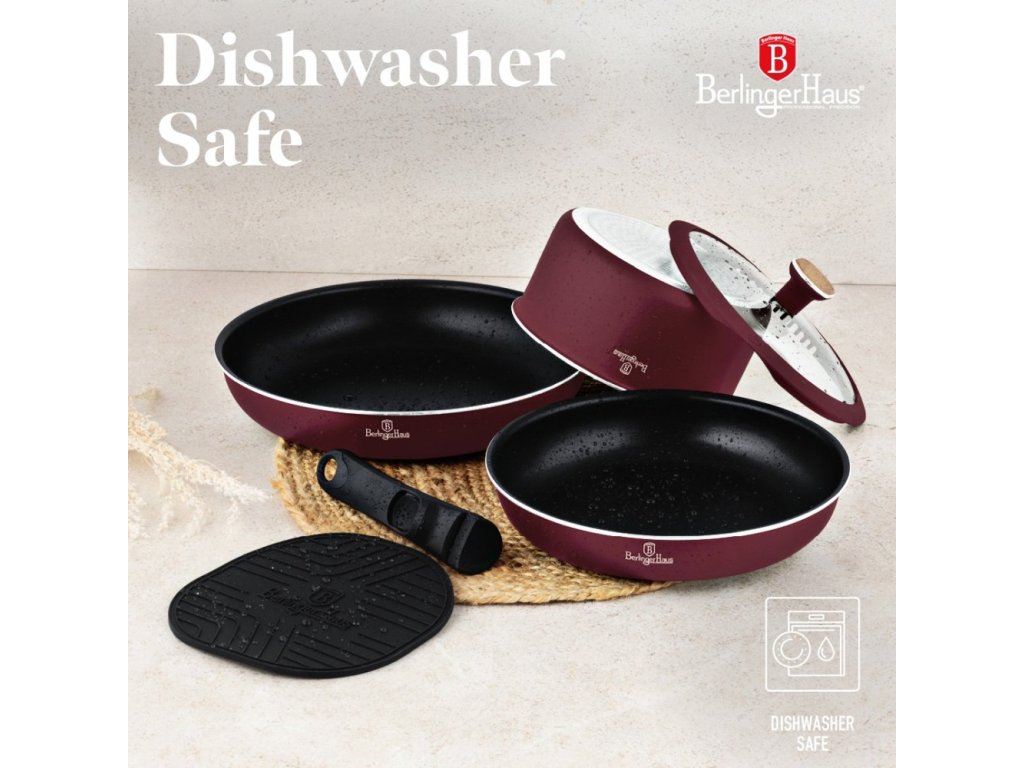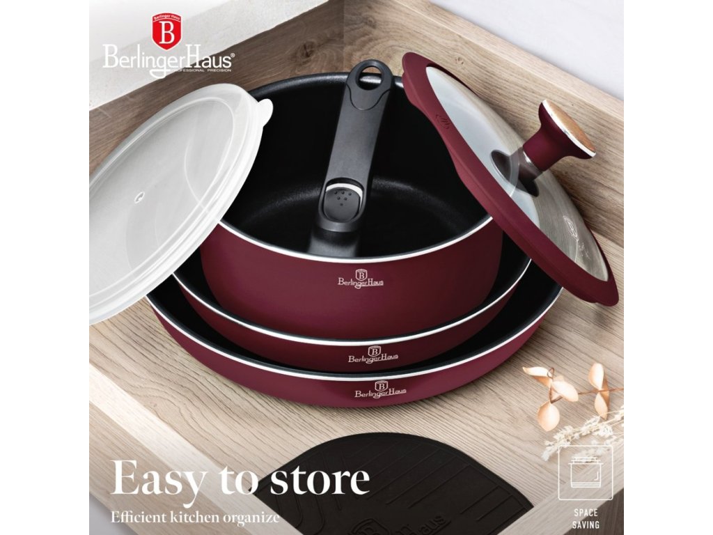 Minimalistický matný povrch v kombinaci bordó a světlého dřeva dodává sadě elegantní vzhled, zatímco turbo indukční dno zajišťuje rychlé a rovnoměrné vaření. Víka z tvrzeného skla se systémem Soft Close umožňují bezpečné manipulování a kontrolu vaření.