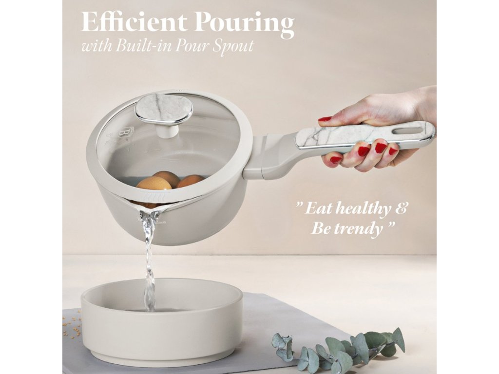 Sahara Marble Collection přináší kombinaci matného krémového povrchu a elegantního mramorového efektu. Tato sada je nejen estetickým skvostem, ale také výkonným nástrojem pro každodenní vaření.