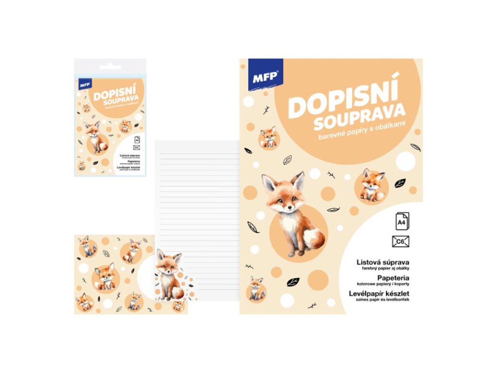 Dopisní sada s jemným motivem lišky je ideální pro všechny, kdo chtějí svému psaní dodat špetku hravosti a kouzla přírody. Linkované papíry a sladěné obálky promění každý vzkaz v malé dobrodružství. BALENÍ OBSAHUJE: 10 potištěných dopisních papírů formátu A4, 5 barevných poštovních obálek formátu C6Doplňkové parametry