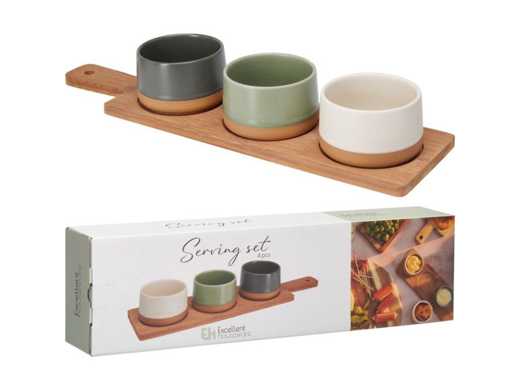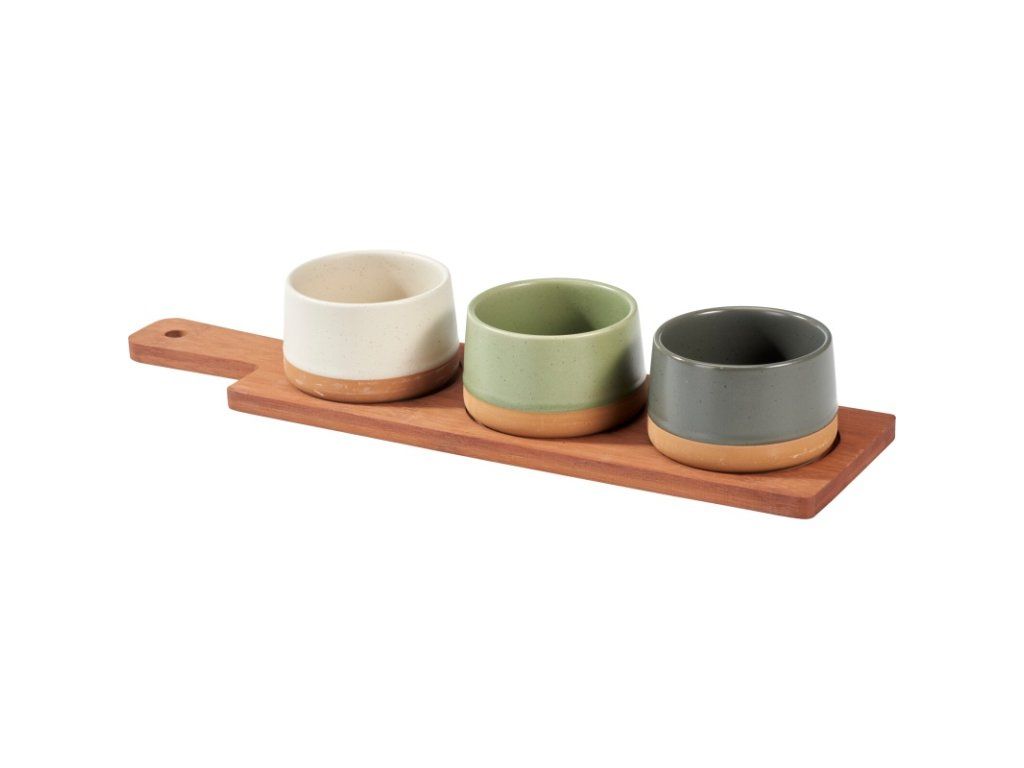 Přineste do svého stolování styl i harmonii. Tato servírovací sada obsahuje tři kameninové misky v zemitých barvách usazené na tmavém bambusovém prkénku. Skvělá volba pro servírování předkrmů, dipů, oříšků nebo malých pochutin při každé příležitosti.