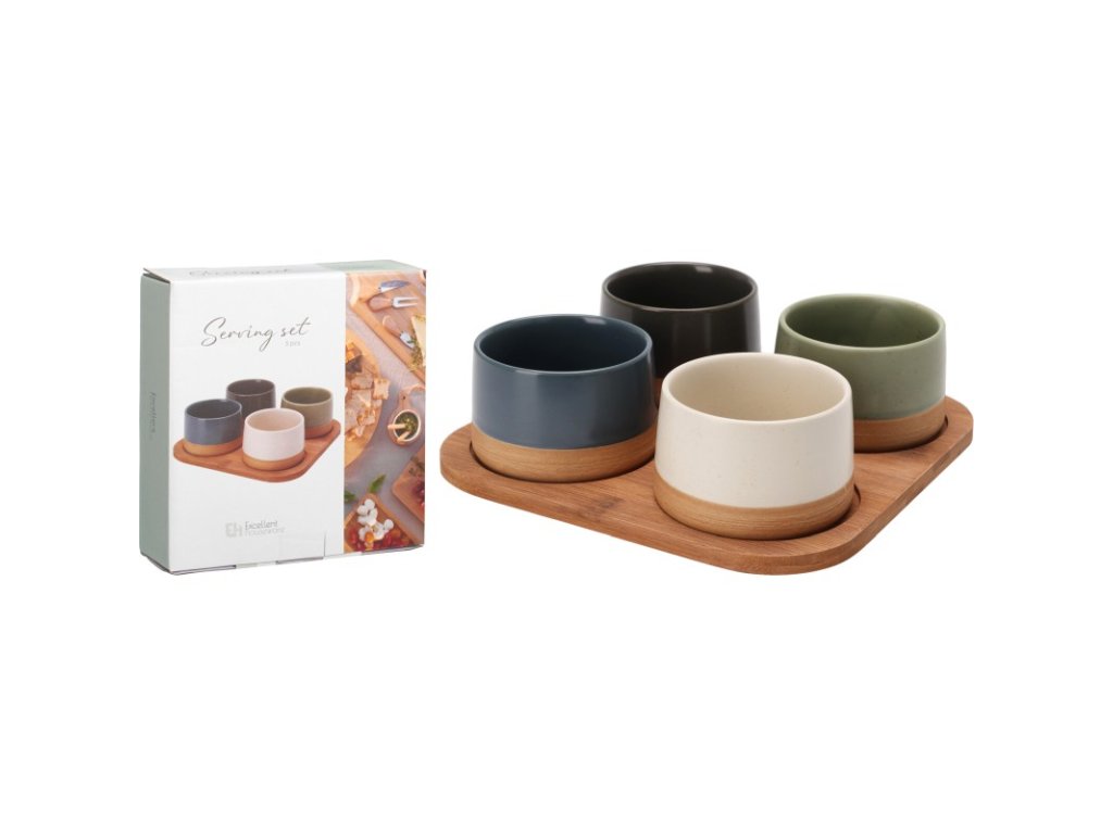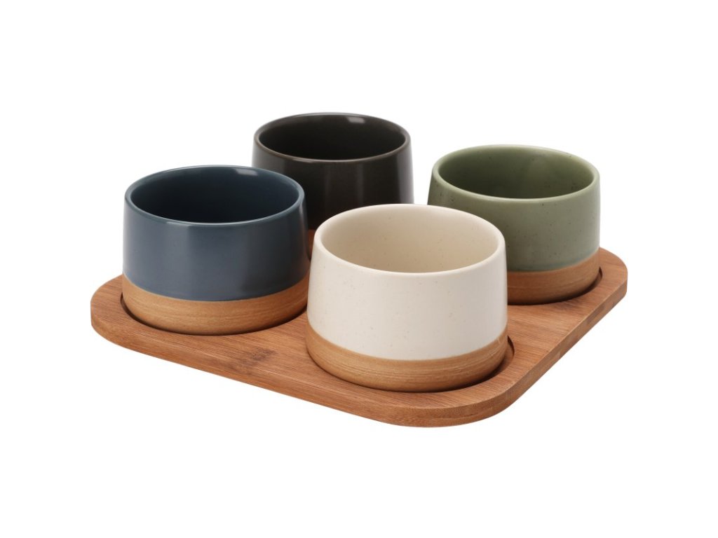 Stylová servírovací sada, která ozdobí každý stůl. Čtyři kameninové misky v přírodních tónech doplňuje tmavý bambusový tácek – ideální na podávání předkrmů, omáček, dipů nebo malých dezertů při každé příležitosti.