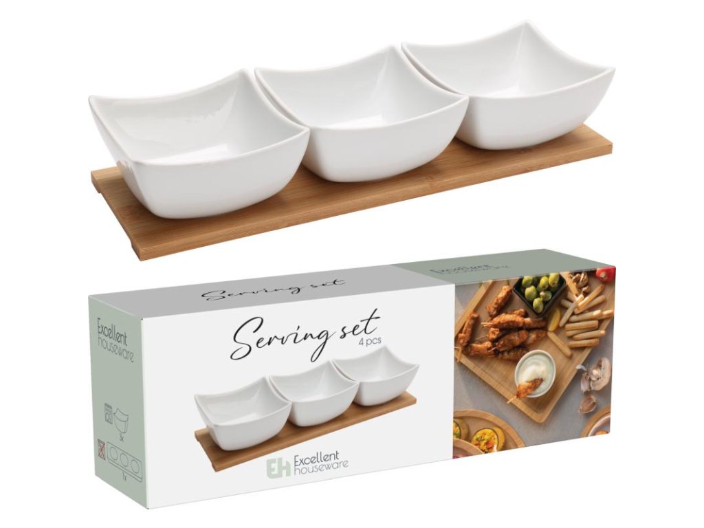Servírovací sada 4 ks EXCELLENT – porcelánové misky na bambusovém podnose