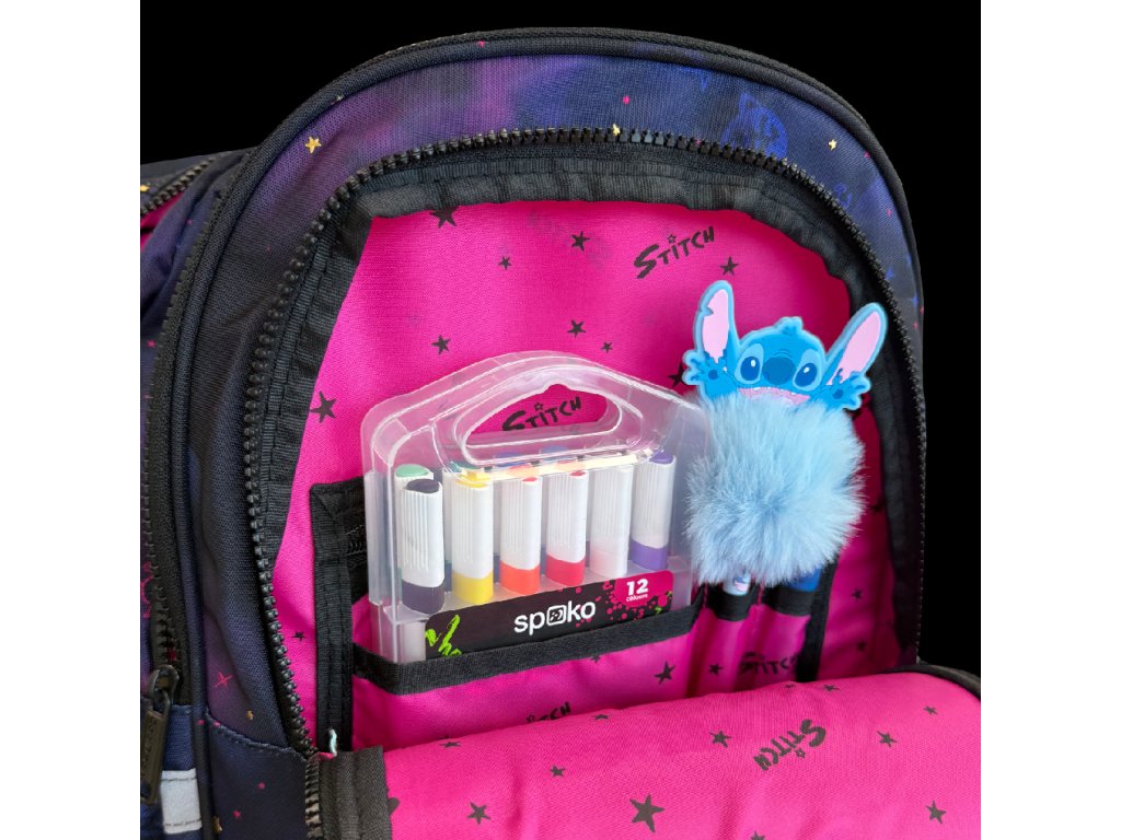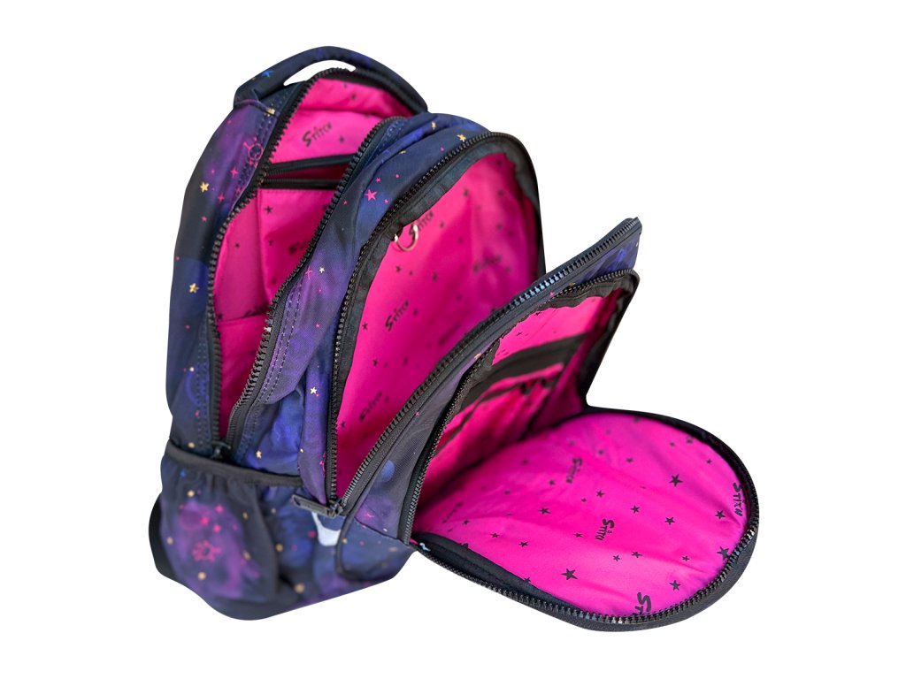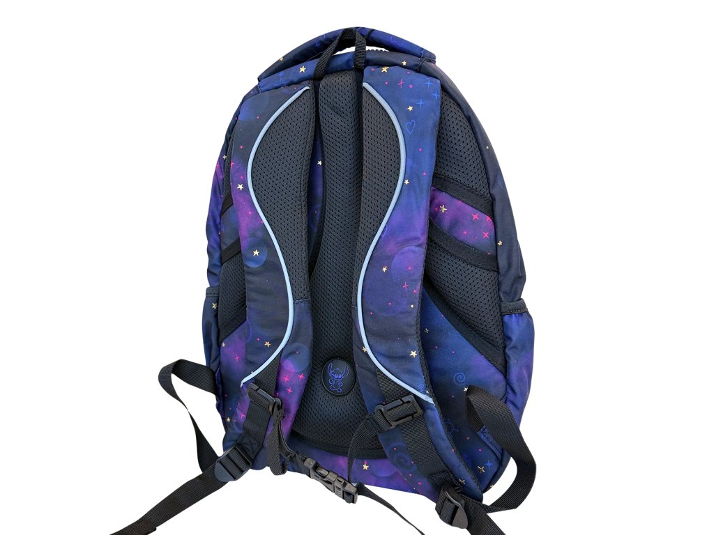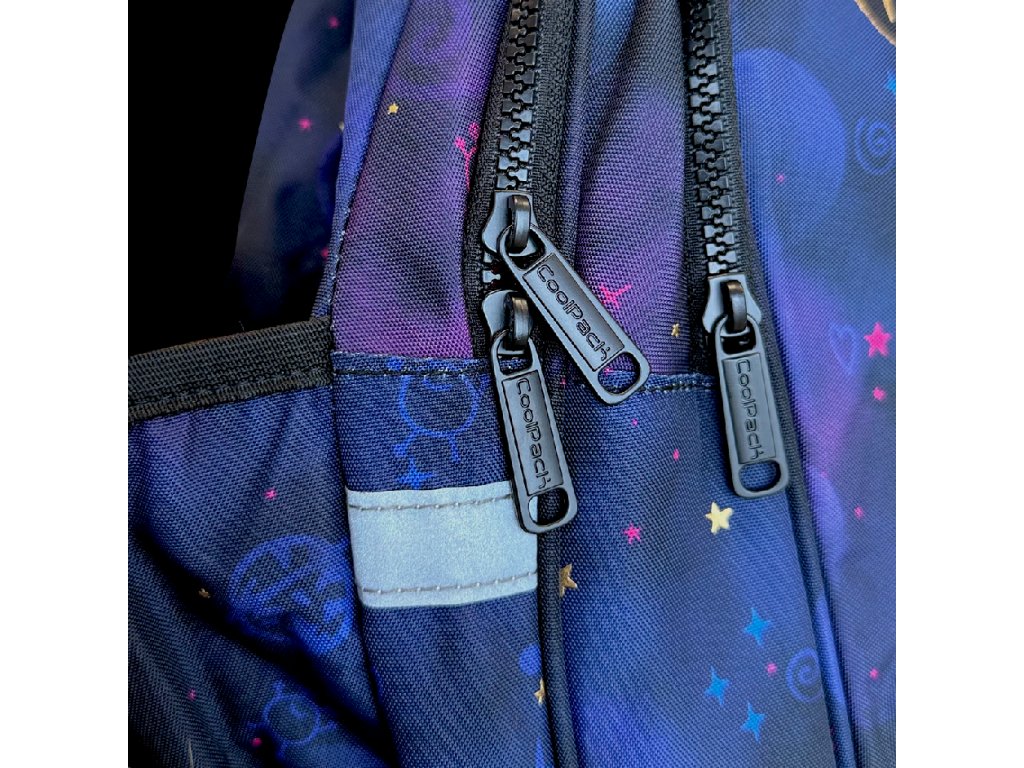 Prostorný školní batoh nabízí praktické uspořádání a pohodlné nošení. Tři hlavní kapsy s robustními zipy, pojmou učebnice, sešity a další školní potřeby. Vnitřní organizér a menší kapsa se zipem jsou ideální pro uložení drobných předmětů. Dvě boční otevřené kapsy se hodí pro láhev s vodou. Integrovaná píšťalka, polstrovaná záda a nastavitelné ramenní popruhy zvyšují komfort při každodenním nošení. Reflexní prvky pro lepší viditelnost dítěte.Doplňkové parametry