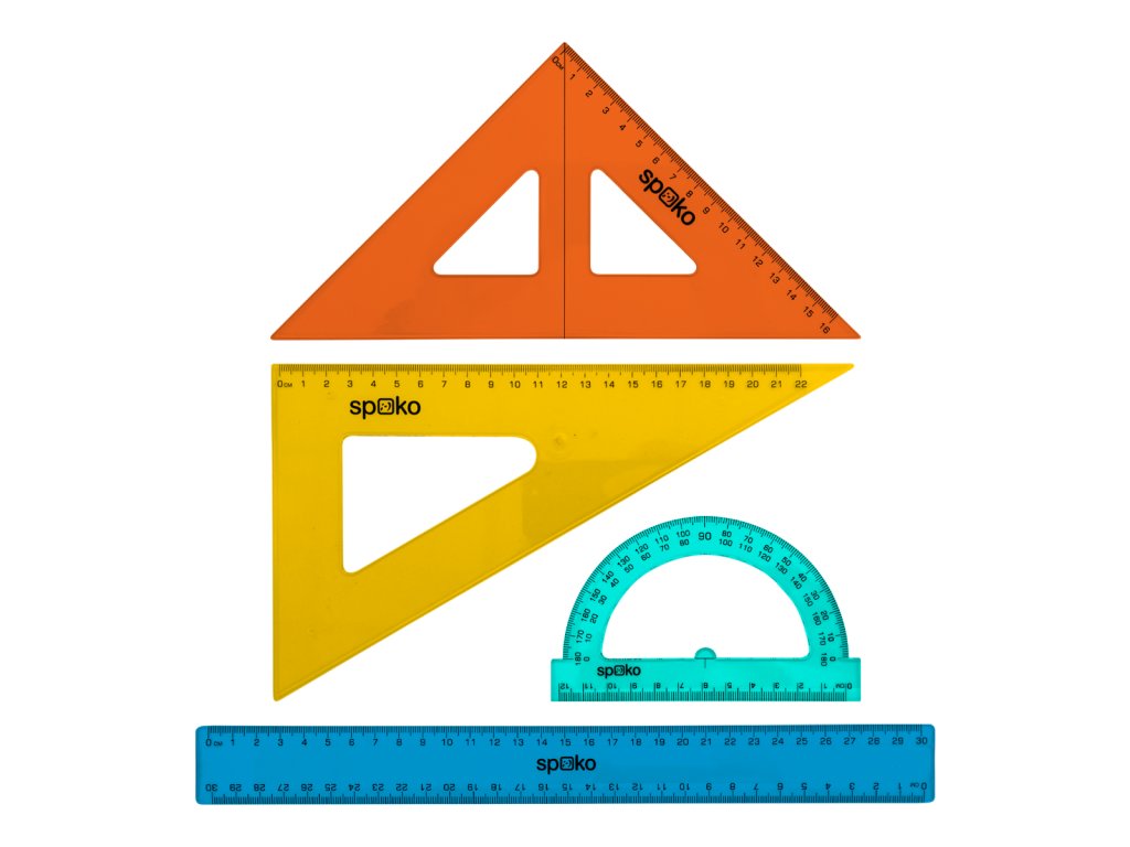 Čtyřdílná sada pravítek, určená pro školní geometrii. Sada obsahuje ploché pravítko, trojúhelník s ryskou, úhloměr, pravoúhlý trojúhelník. Balení s euro závěsem.Doplňkové parametry