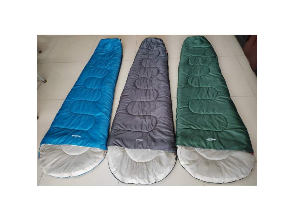 spací pytel mumie s polštářem 230x80x50cm, vnější materiál 190t polyester, podšívka 190t, výplň polyesterové vlákno 200g/m2, s-šití, normální plnicí pytel s potiskem a logem, nylonový zip s 1 taháčkem, čtvercový popruh na suchý zip, vnitřní barva světle šedá, logo na spacím pytli a pytli, pro +10 - +20 stupňů celsia, 3 různé barvy: modrá, zelená a tmavě šedá, každá s visačkou a štítkem na přišití.Doplňkové parametry
