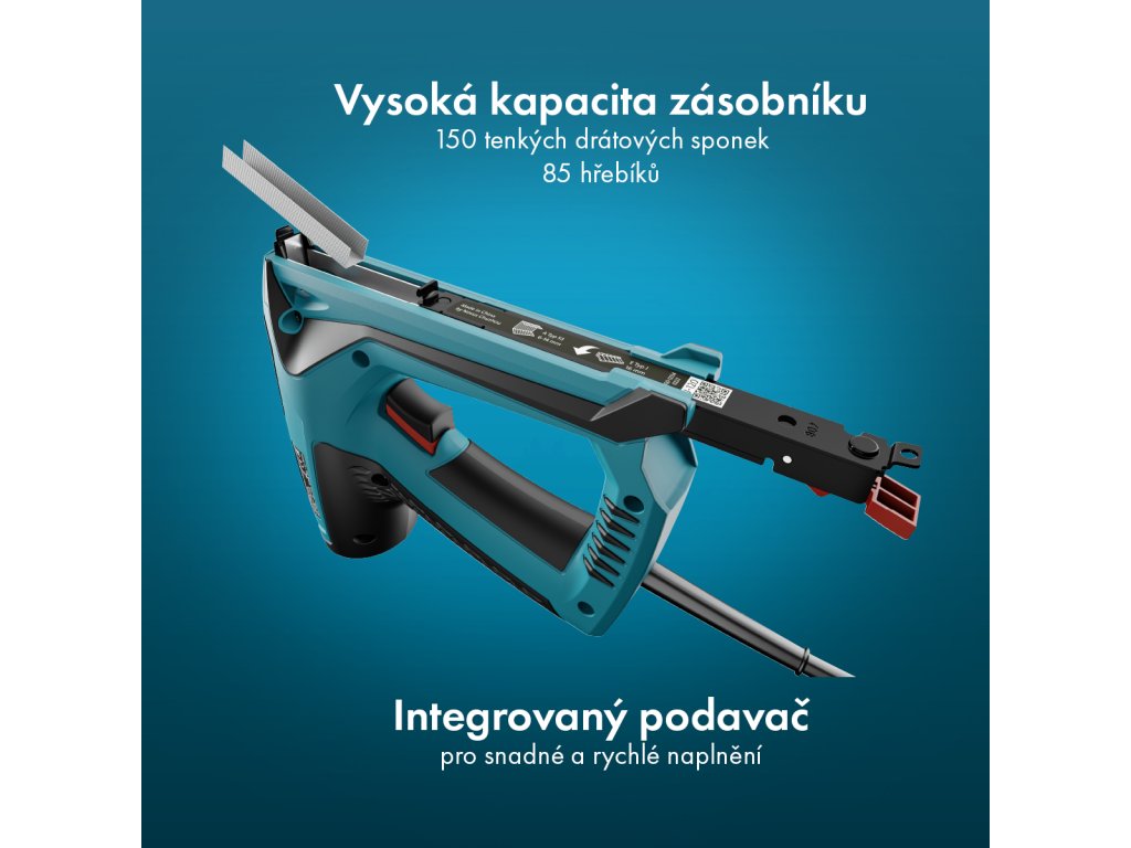 Malá výkonná elektrická sponkovačka, vhodná pro upevnění látek a textilií, ideální pro interiérové dekorace a práci v dílně. Kompatibilní se sponkami typu A a hřebíky typu E. Nástřelný hrot a designová linka pro přesné umístění a usazení sponek, a to i na těžko dostupných místech. Ochrana proti prázdnému výstřelu – sponky se uvolňují pouze při kontaktu s materiálem. Integrovaný podavač se spodním plnění pro snadné a rychlé doplnění. Kontrolní průhled pro rychlý přehled kapacity spon. Dlouhý napájecí kabel pro práci ve vyšších a hůře dostupných místech. Ergonomická rukojeť s příjemným povrchem pro maximální pohodlí.Doplňkové parametry