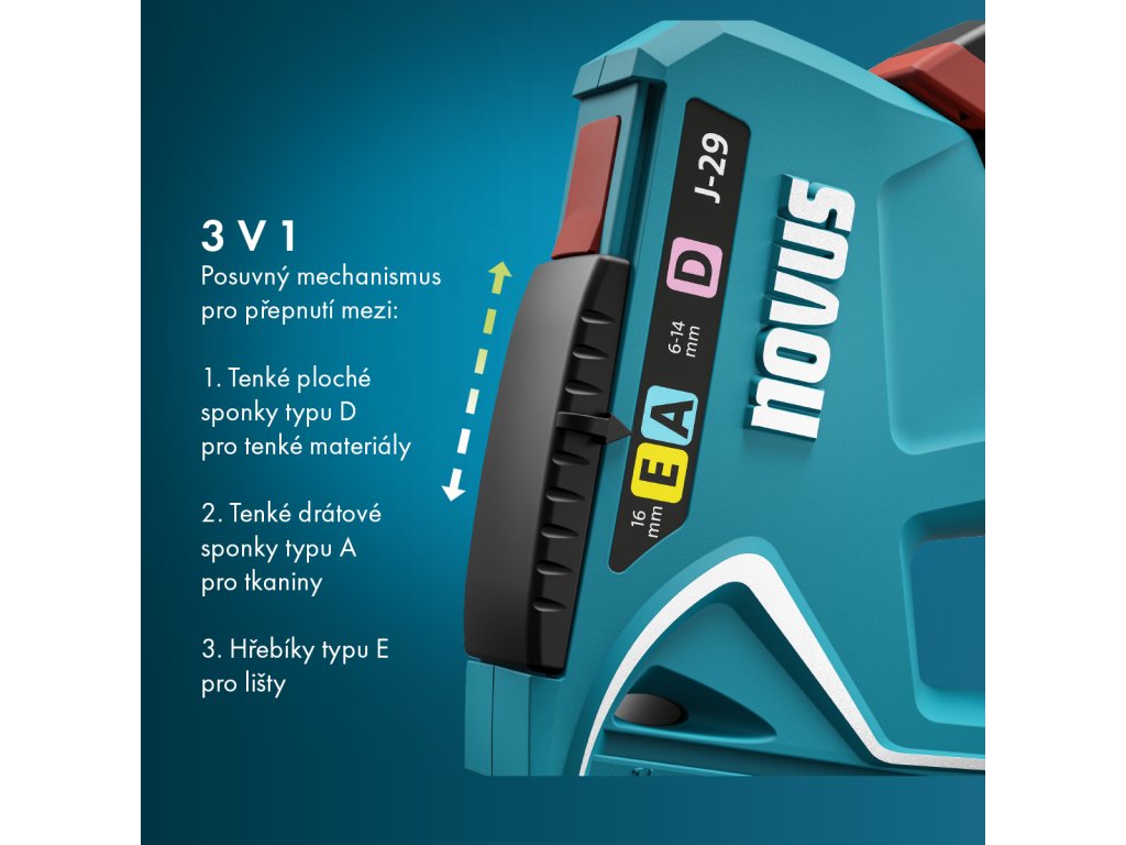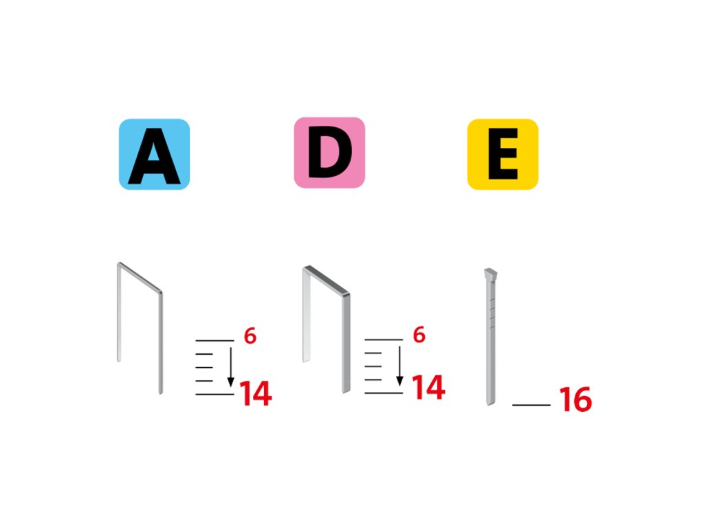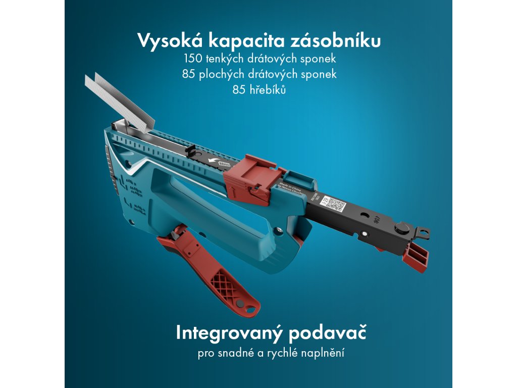 | kapacita zásobníku: | 150 ks - typ H, A/ 6 - 14 mm, 85 ks - typ D/ 6 - 14 mm, hřebíky 85 ks - typ E / 16 mm |