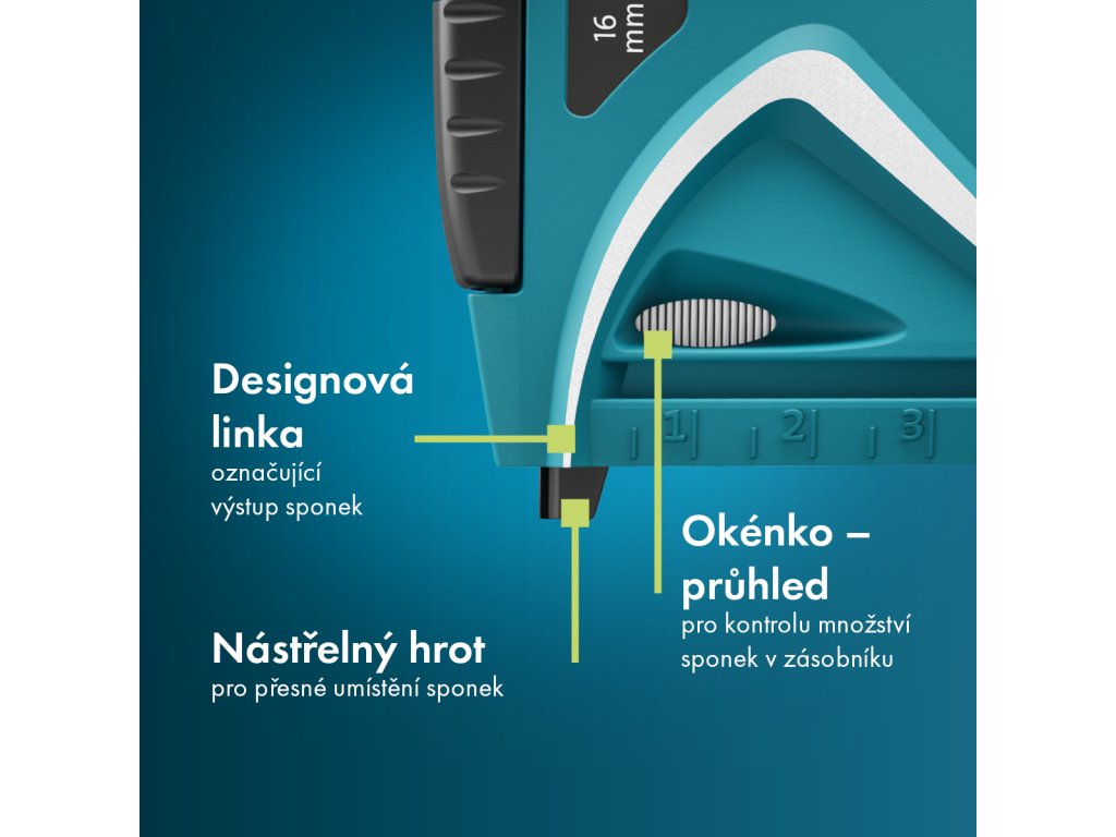 Malá profesionální sponkovačka se zvláště nízkým zpětným rázem a tělem z tlakově litého zinku. Vhodná pro připevnění tkanin, lišt, hladkého a plochého materiálu. Kompatibilní s plochými a drátěnými sponkami typu A, D, E a G, H pro kladivovou sponkovačku. Nastavení síly úderu pro zapuštění do tvrdého nebo měkkého dřeva. Nástřelný hrot pro umístění sponek, distanční doraz pro jejich přesné rozmístění, přepínání mezi jednotlivými typy. Integrovaný podavač se spodním plnění pro snadné a rychlé doplnění. Kontrolní průhled pro rychlý přehled kapacity spon. Designová linka pro maximálně přesné usazení sponky do materiálu. Ergonomická rukojeť s bezpečnostní pojistkou a měkkým povrchem pro maximální pohodlí.Doplňkové parametry