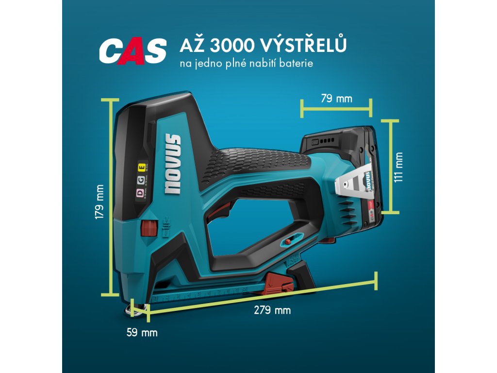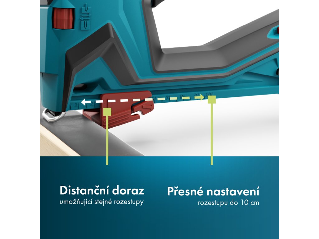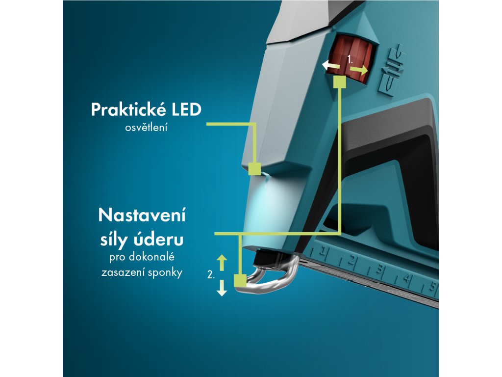 Výkonná profesionální akumulátorová sponkovačka pro dokonalé upevnění různých typů fólií a dekoračních lišt. Určená pro práci na stavbě nebo v dílně. Baterie 18 V Li-ion, s akumulátorem CAS. Kompatibilní se sponami a hřebíky typu D, G, E. Nástřelný hrot pro přesné umístění sponek, distanční doraz pro jejich přesné rozmístění. Nastavitelná síla úderu pro optimální výsledek. Designová linka pro maximálně přesné usazení sponky do materiálu. Kontrolní průhled pro rychlý přehled kapacity spon. Gumový plášť pro ochranu citlivých materiálů. LED osvětlení, možnost přichycení k opasku. Ergonomická rukojeť s bezpečnostní pojistkou a měkkým povrchem pro maximální pohodlí. Sada obsahuje stohovatelný kufr, 1 × 18 V CAS baterie, nabíječku a 5000 ks sponek.Doplňkové parametry