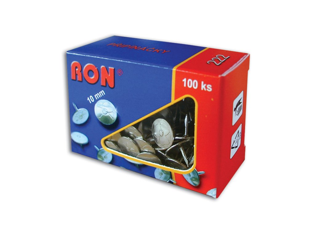 Připínáčky RON 222 jsou nýtované kovové připínáčky s průměrem hlavičky 10 mm a délkou 8 mm. Balení obsahuje 100 kusů. Jsou ideální pro rychlé přichycení papíru na korkové nástěnky, dřevo, karton a podobné materiály.Doplňkové parametry