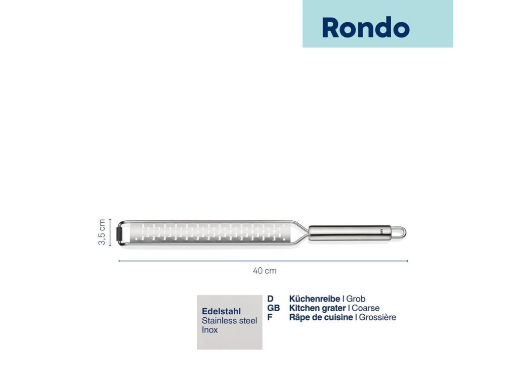 Struhadlo na sýr Rondo od značky KELA je vyrobeno z kvalitní nerezové oceli a nabízí elegantní a praktické řešení pro strouhání sýrů a dalších ingrediencí. Jeho dlouhá rukojeť a dostatečná velikost umožňují pohodlné a efektivní strouhání i větších množství surovin. Díky vysoce kvalitnímu nerezovému materiálu je struhadlo odolné, snadno se čistí a dlouho vydrží.