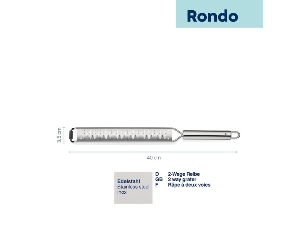 ?Struhadlo Rondo od značky KELA je vyrobeno z nerezové oceli a je určeno pro strouhání zázvoru, křenu, jablek na hrubší kaši, čokolády, parmazánu či citronu. Jeho kompaktní tvar s konkávním roštem usnadňuje práci. Rozměry struhadla jsou 32,5 cm na délku a 6,5 cm na šířku.Doplňkové parametry