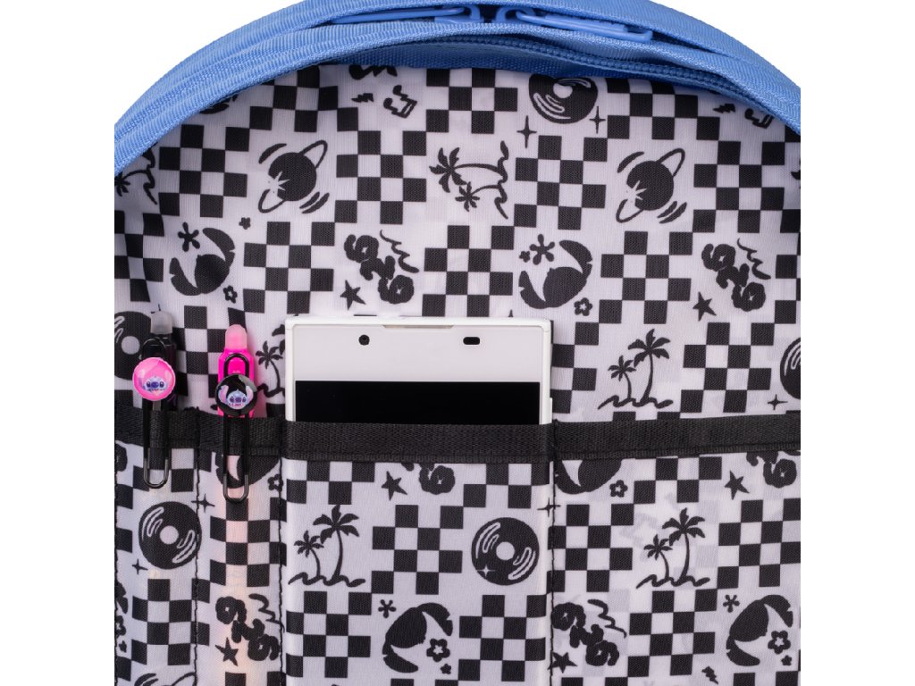 Černý batoh Scout se stříbrným potiskem Stitche a barevně sladěnou klíčenkou.Doplňkové parametry