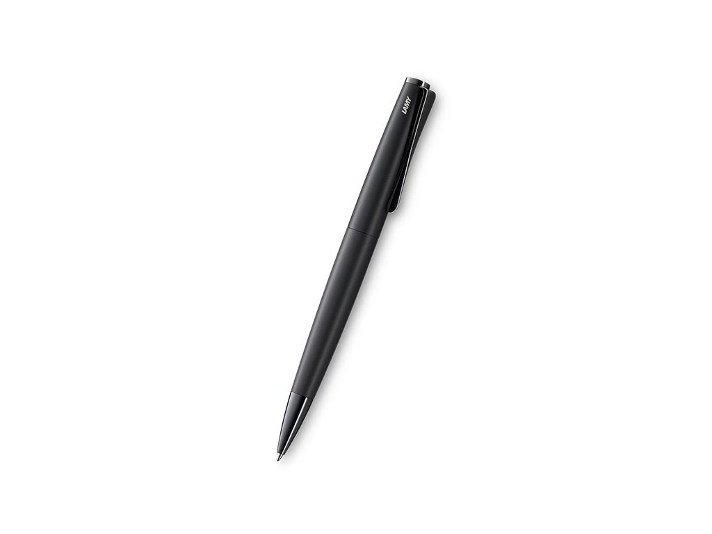 Matně černé lakované tělo z nerezové oceli. Úchop a klip v originálním tvaru vrtule z nerezové oceli pokovené černou barvou pomocí techniky PVD., Vlastnosti kuličkového pera Lamy studio Lx all black* otočný mechanismus