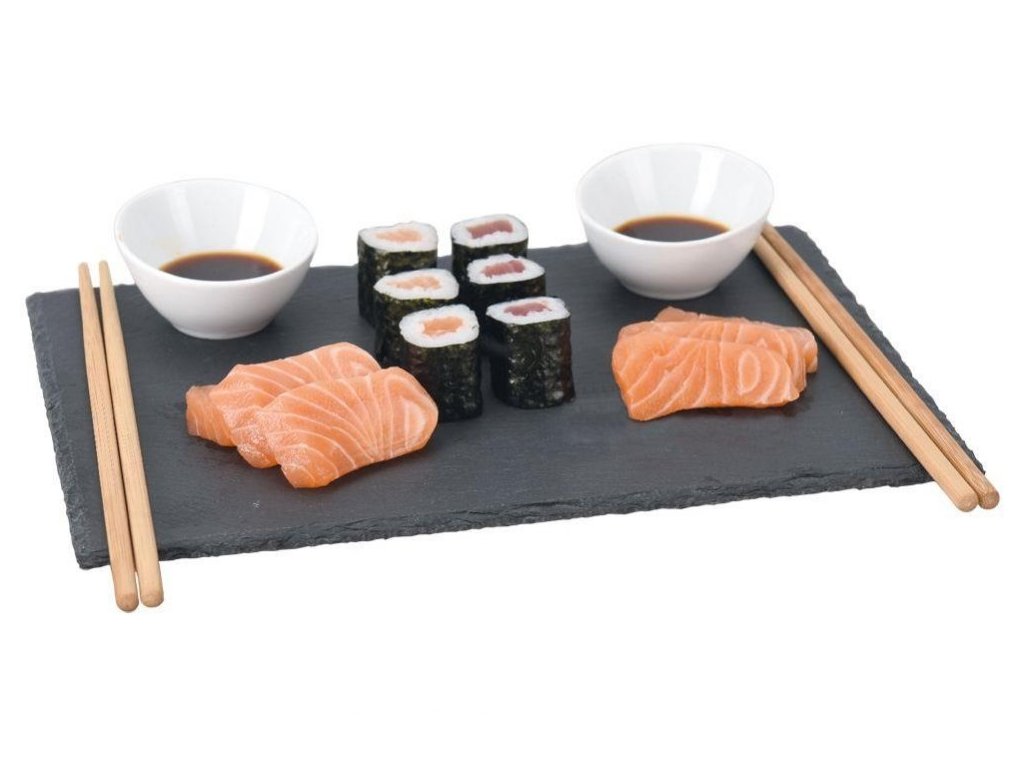 - kompletní sushi set pro 1 nebo 2 osoby- autentické materiály stejně jako v japonské kuchyni- břidlicová servírovací deska, nádoby z bílého porcelánu a bambusové hůlky- skvělý dárek pro milovníky orientální kuchyně- Sada 7 ks obsahuje:- 1x servírovací břidlicová podložka 30 x 20 x 0.5 cm- 2x porcelánová miska 8 x 3.8 cm- 2 páry bambusových hůlek 24 cmDoplňkové parametry